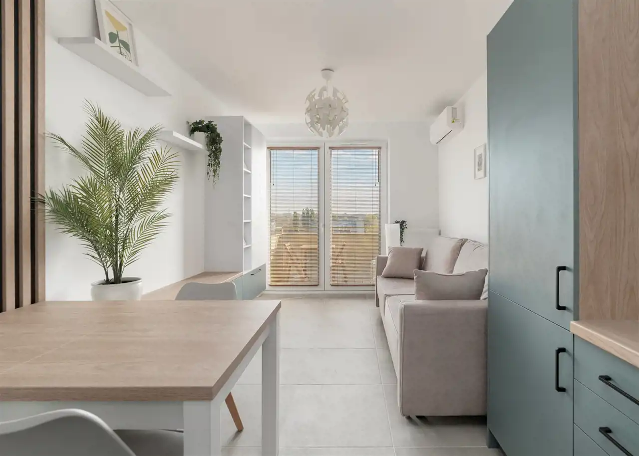 - klimatyzowany salon z częścią wypoczynkową i jadalną oraz wyjściem na balkon;