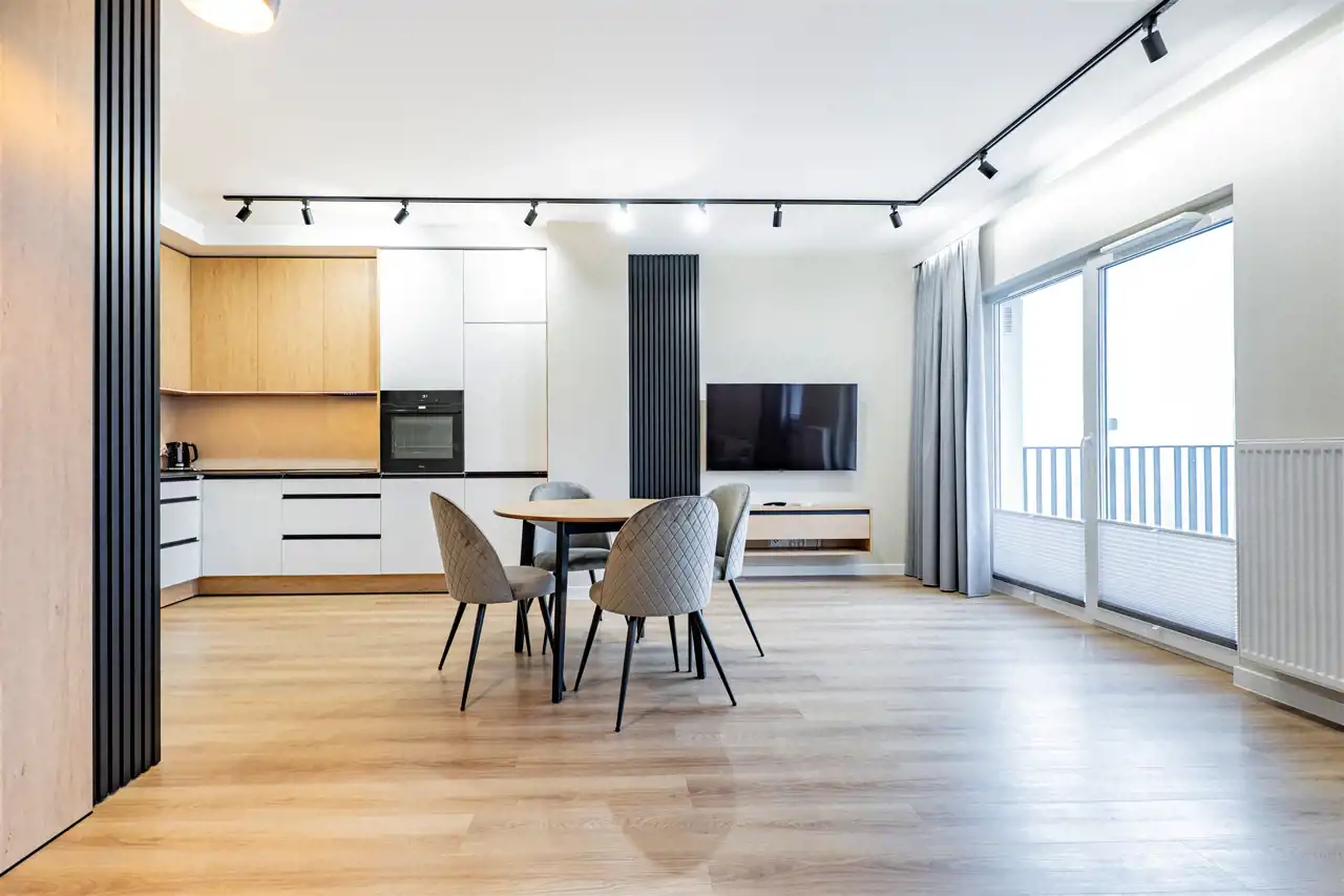 Apartament został wykończony w nowoczesny, niebanalny sposób przez architekta. W salonie znajdziemy wygodną rozkładaną sofę, szafkę RTV, telewizor oraz stół z krzesłami. Aneks kuchenny wyposażony w lodówko-zamrażarkę, zmywarkę, piekarnik, płytę indukcyjną. W sypialniach znajdują się dwuosobowe łóżka oraz pakowne szafy. Czwarty pokój może zostać zaadaptowany przez najemcę na gabinet. Toaleta z wanną z funkcją prysznica, umywalką, pralką oraz oddzielne WC. Dodatkowo w przedpokoju znajduje się pakowna szafa z licznym miejscem do przechowywania.