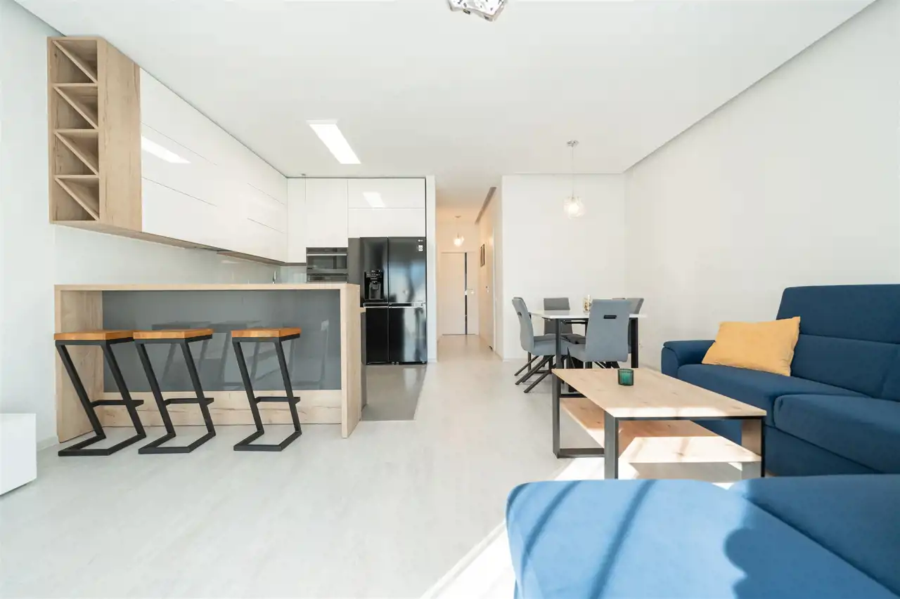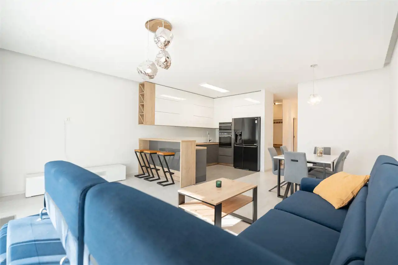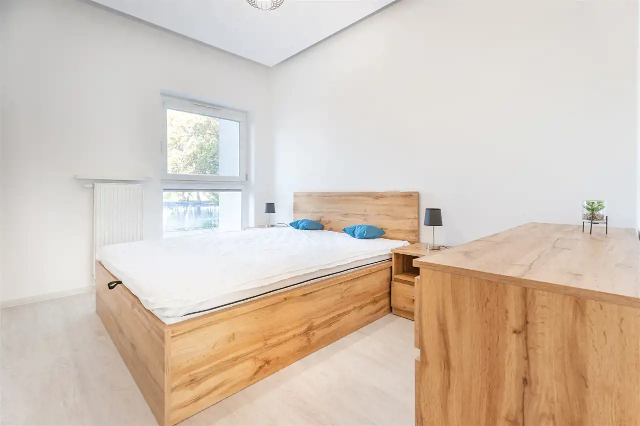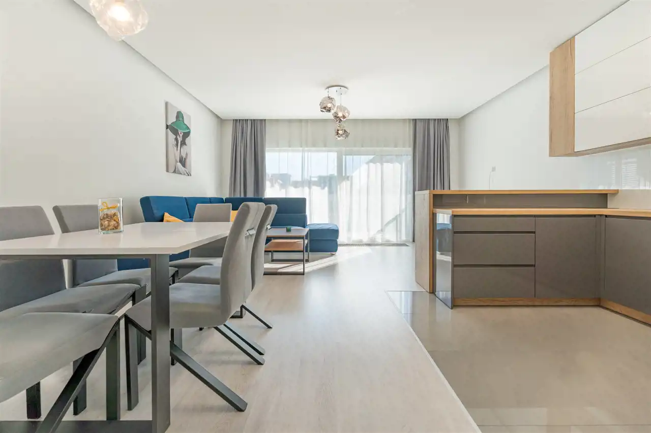 Apartament posiada przy salonie ogromny taras, około 10 m2, z którego roztacza się wspaniały widok na zagospodarowany teren osiedla, co gwarantuje potencjalnemu najemcy ciszę i spokój. W salonie komfortowa kanapa i stół z krzesłami (rozkładany). Sypialnia posiada łóżko podwójne z materacem, szafki nocne i szafę, druga sypialnia pusta - do własnej aranżacji. Do mieszkania przynależy miejsce parkingowe w garażu podziemnym - blisko windy.