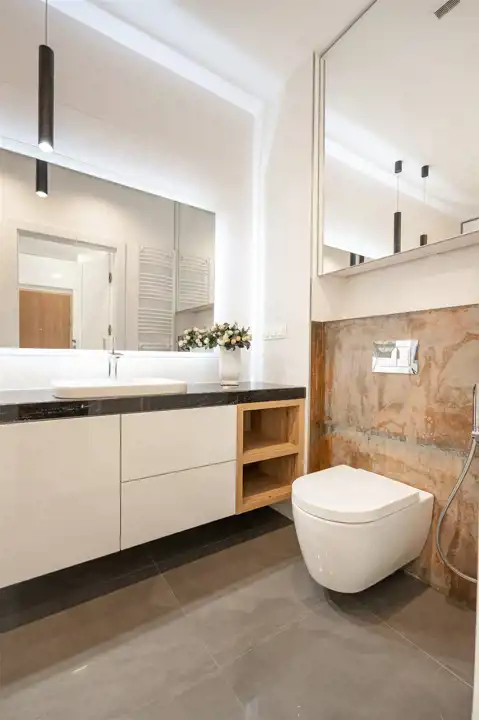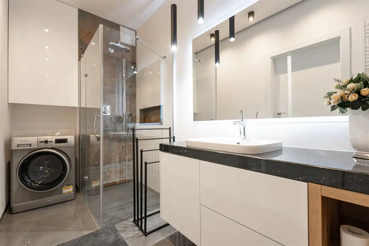 Łazienka wraz z WC, wykończona w wysokiej klasy ceramice i armaturze. Blat w łazience granitowy, do dyspozycji najemcy pralka i suszarka.