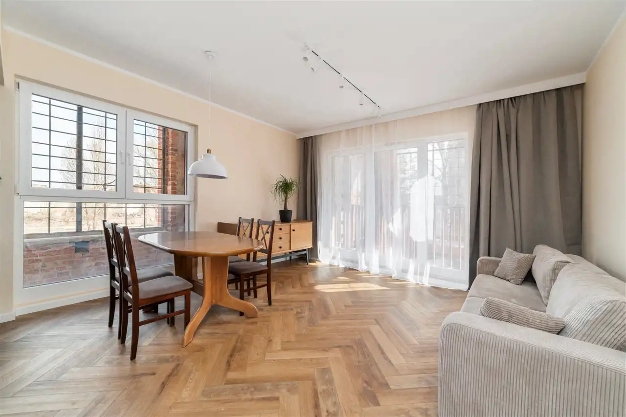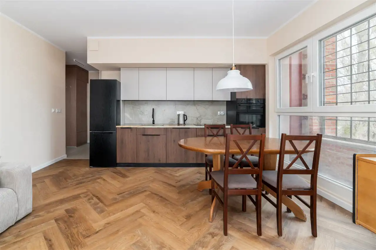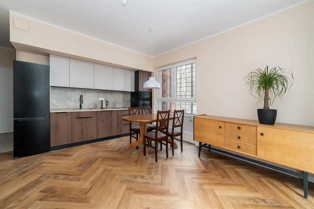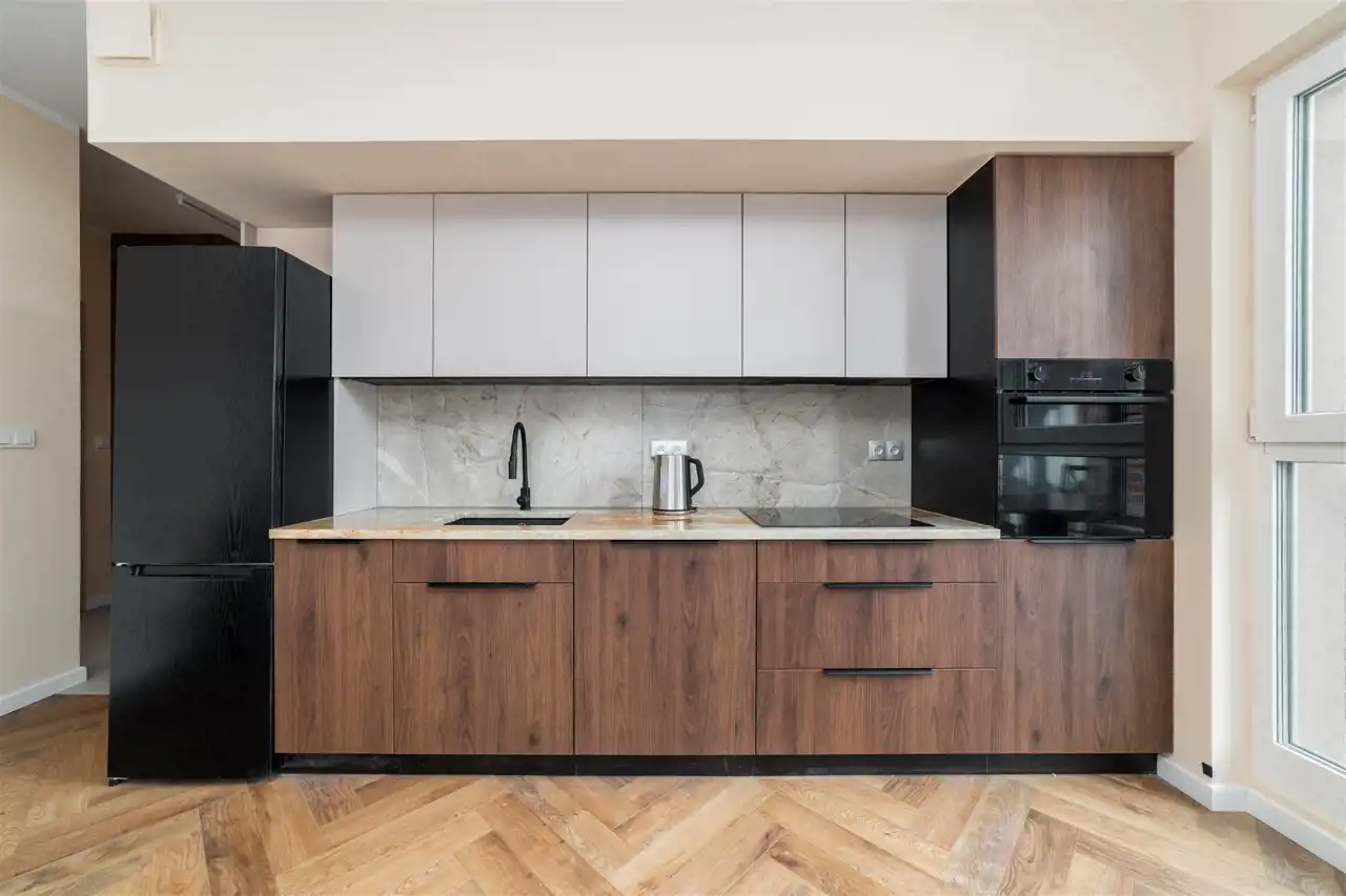 - aneks kuchenny wyposażony w płytę indukcyjną, piekarnik, lodówko-zamrażarkę i zmywarkę;