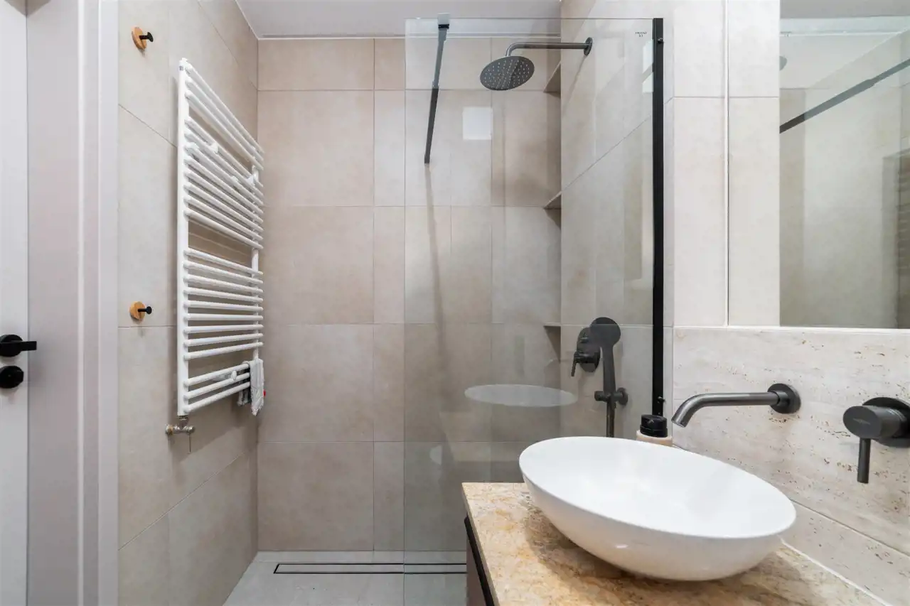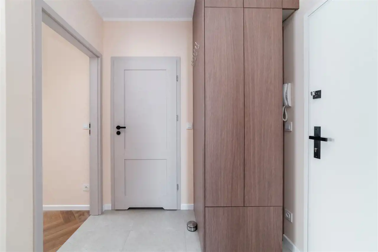 - nowoczesną łazienkę z WC wyposażoną w prysznic oraz zabudowę w której m.in znajduje się pralka;
