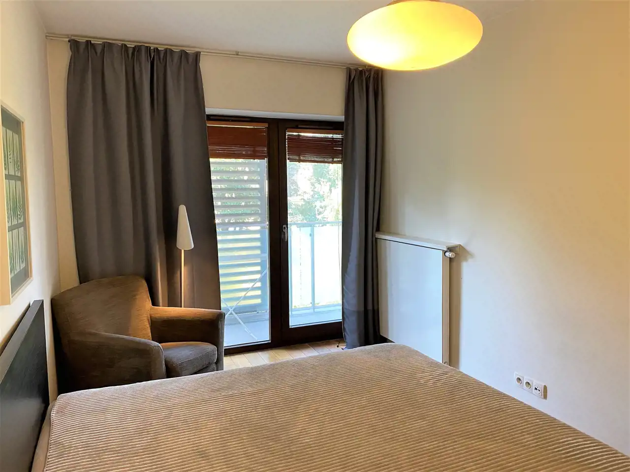 - SYPIALNIA: ok. 14,46 m², łóżko podwójne, szafka nocna, wbudowana duża szafa na całej ścianie, fotel, lampa stojąca