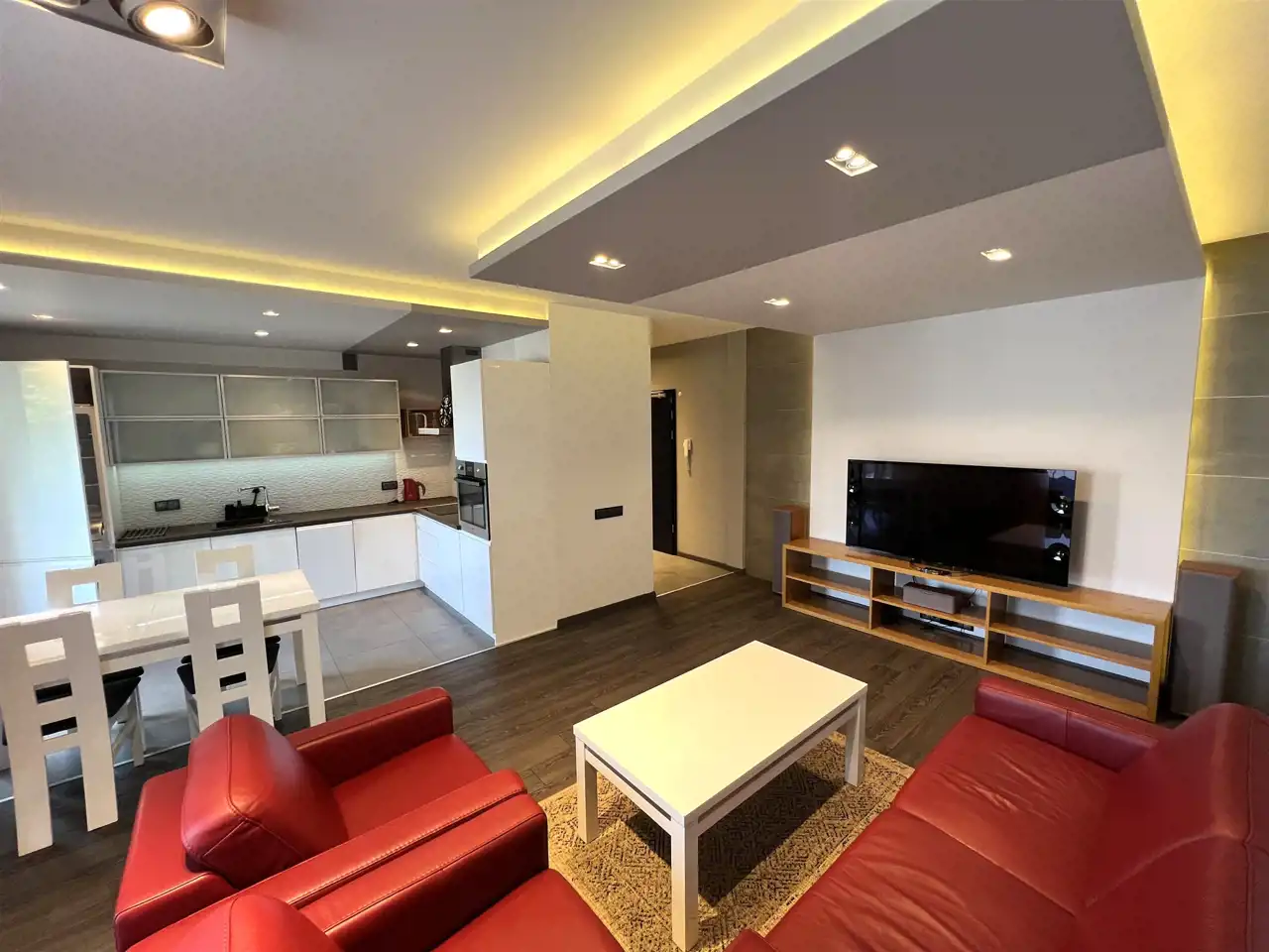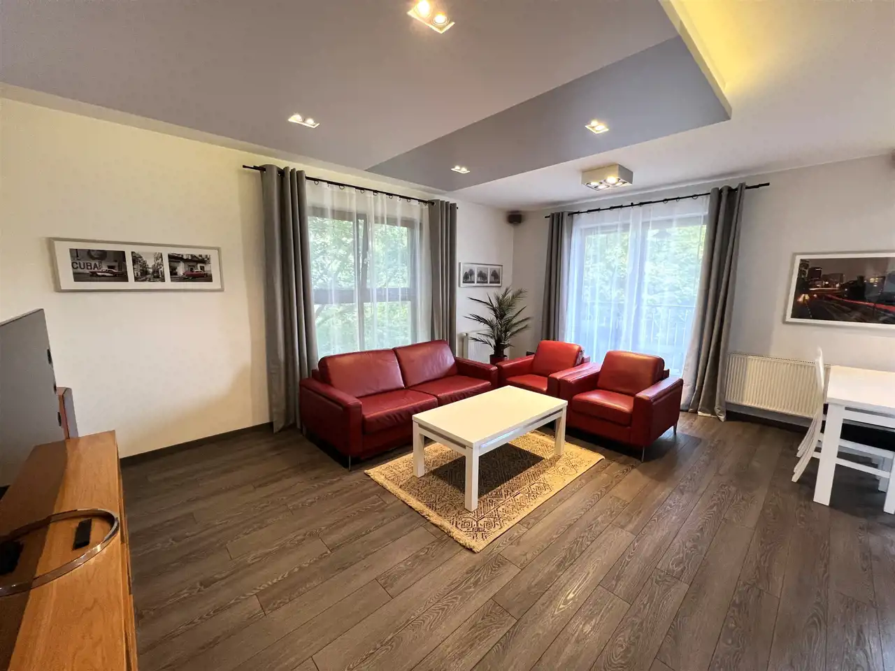 - SALON: 24 m2, salon z aneksem kuchennym, skórzany zestaw wypoczynkowy (rozkładana kanapa + 2 fotele), ława, szafka RTV, telewizor, wyjście na bardzo duży balkon z widokiem na park,