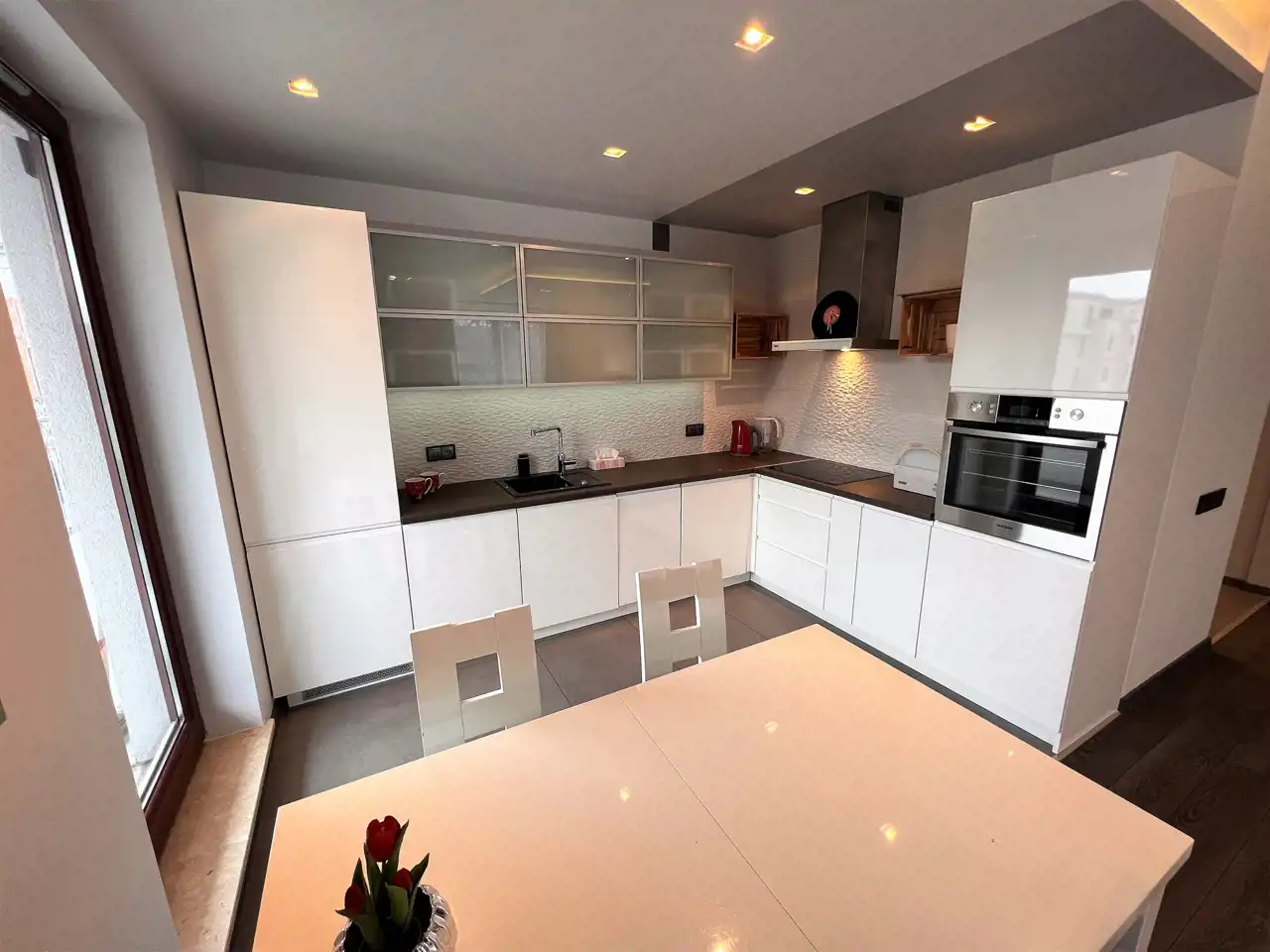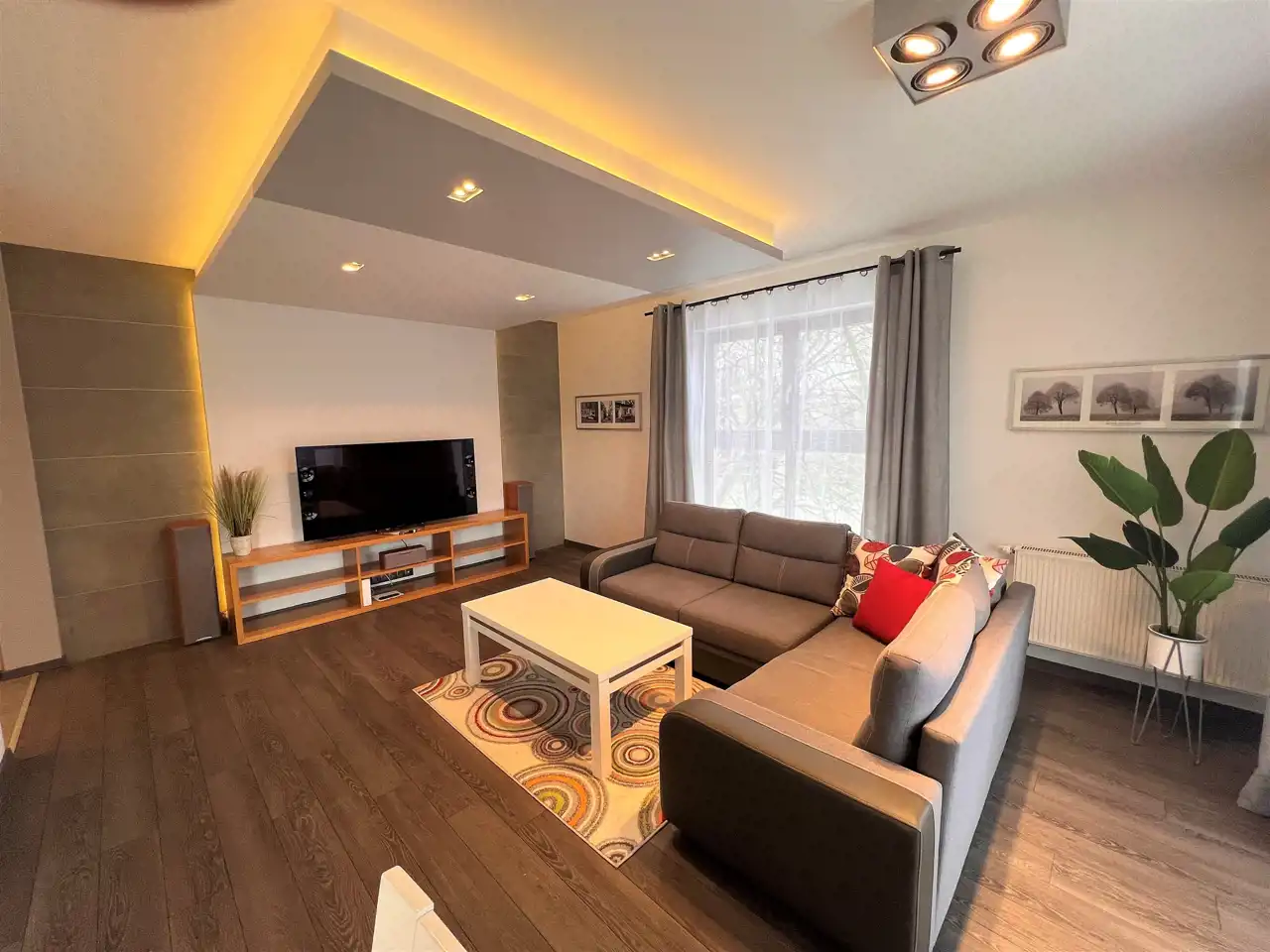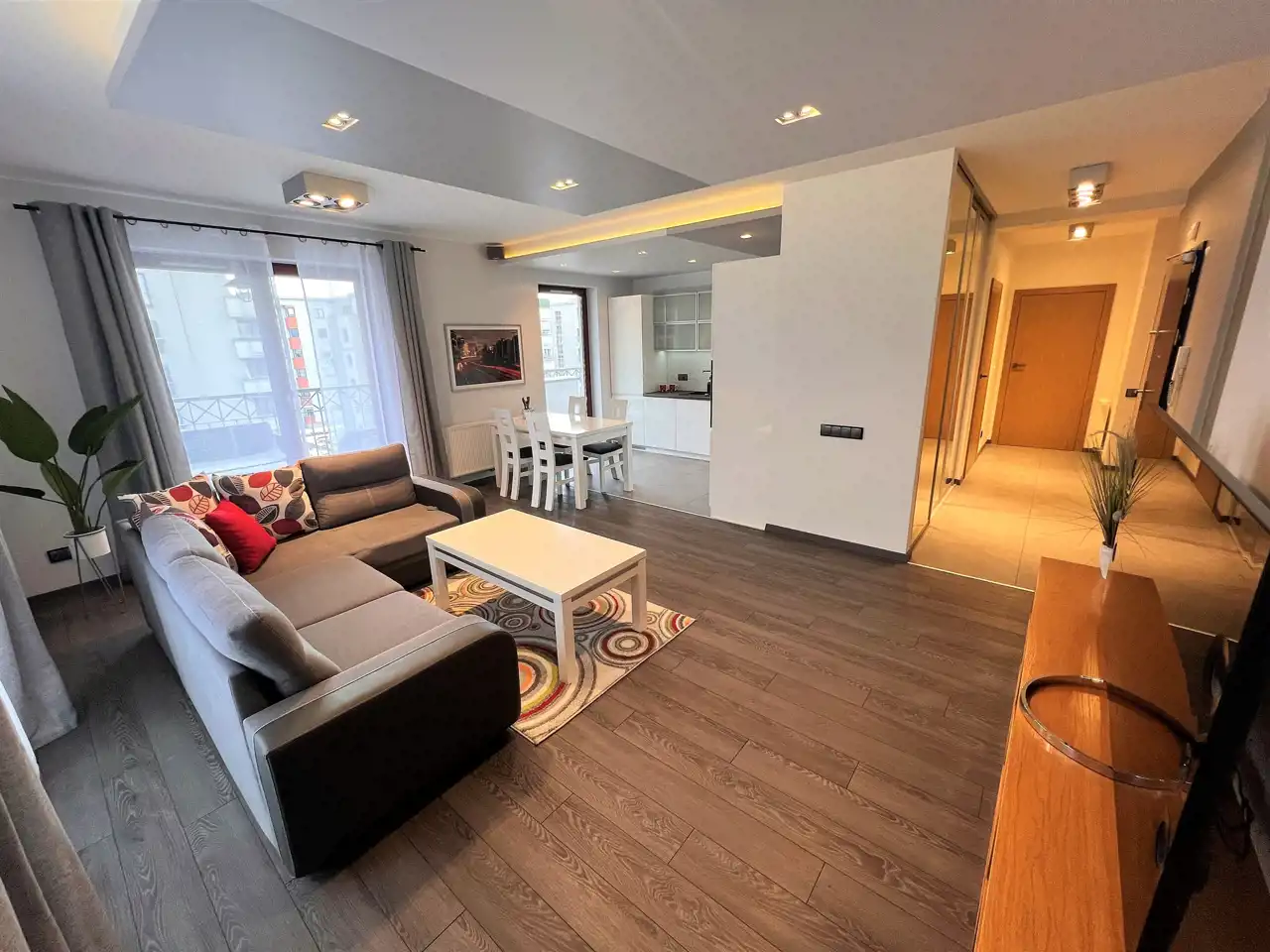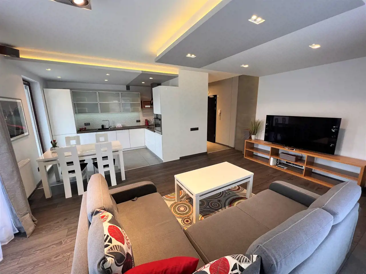 - SALON: 24 m2, salon z aneksem kuchennym, skórzany zestaw wypoczynkowy (rozkładana kanapa + 2 fotele), ława, szafka RTV, telewizor, wyjście na bardzo duży balkon z widokiem na park,