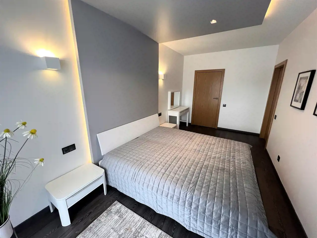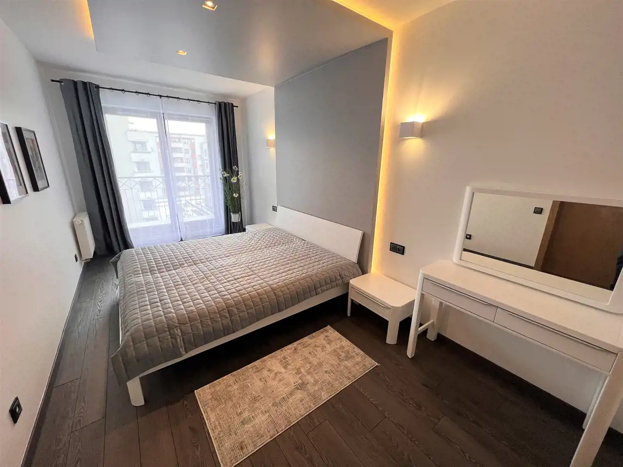 - SYPIALNIA: 15,62 m2, łóżko podwójne z materacem, 2 szafki nocne, toaletka z krzesłem i z lustrem, przy sypialni garderoba o pow. 4,07 m2 z regałem na ubrania, wyjście na bardzo duży balkon z widokiem na park,