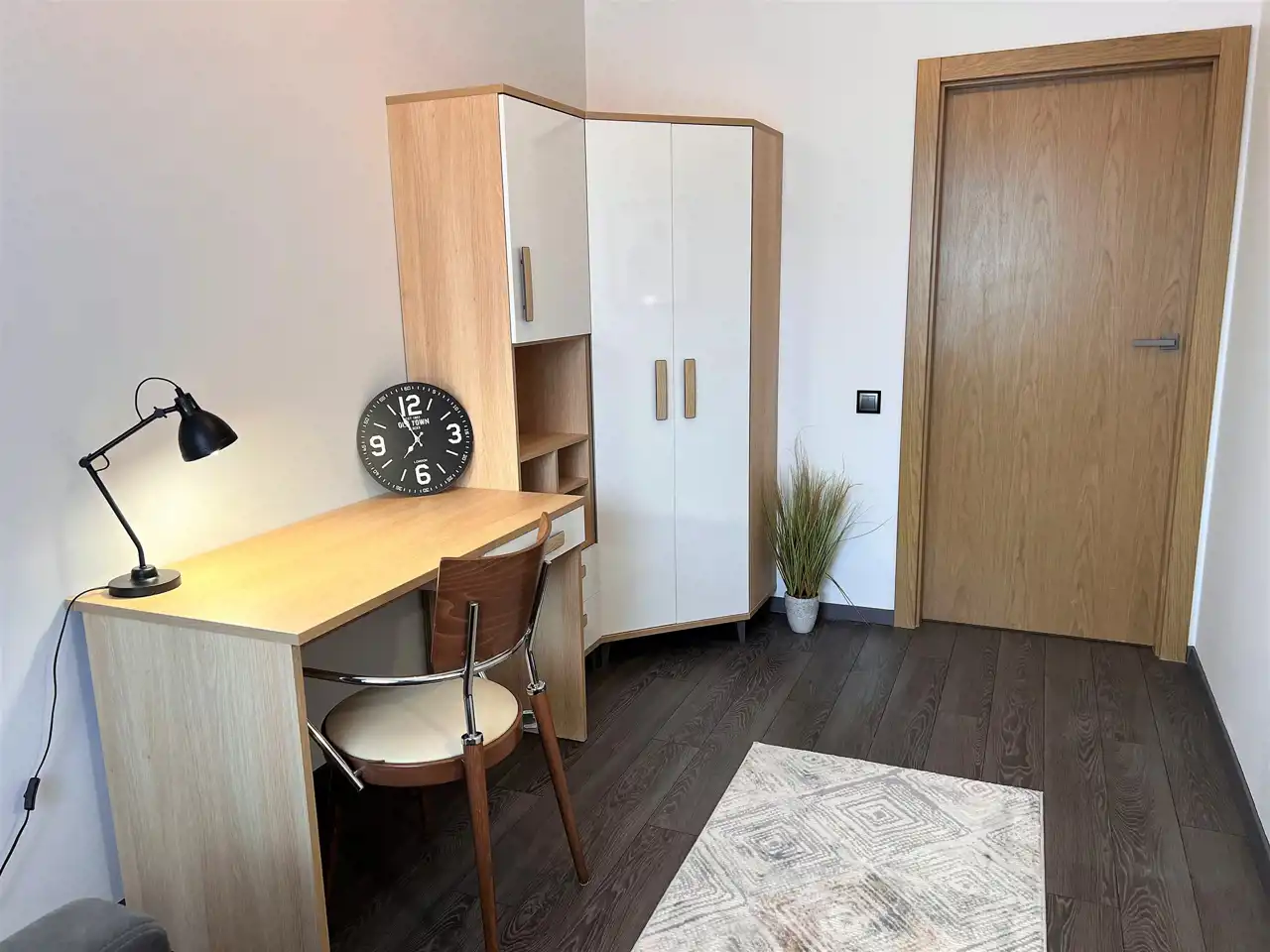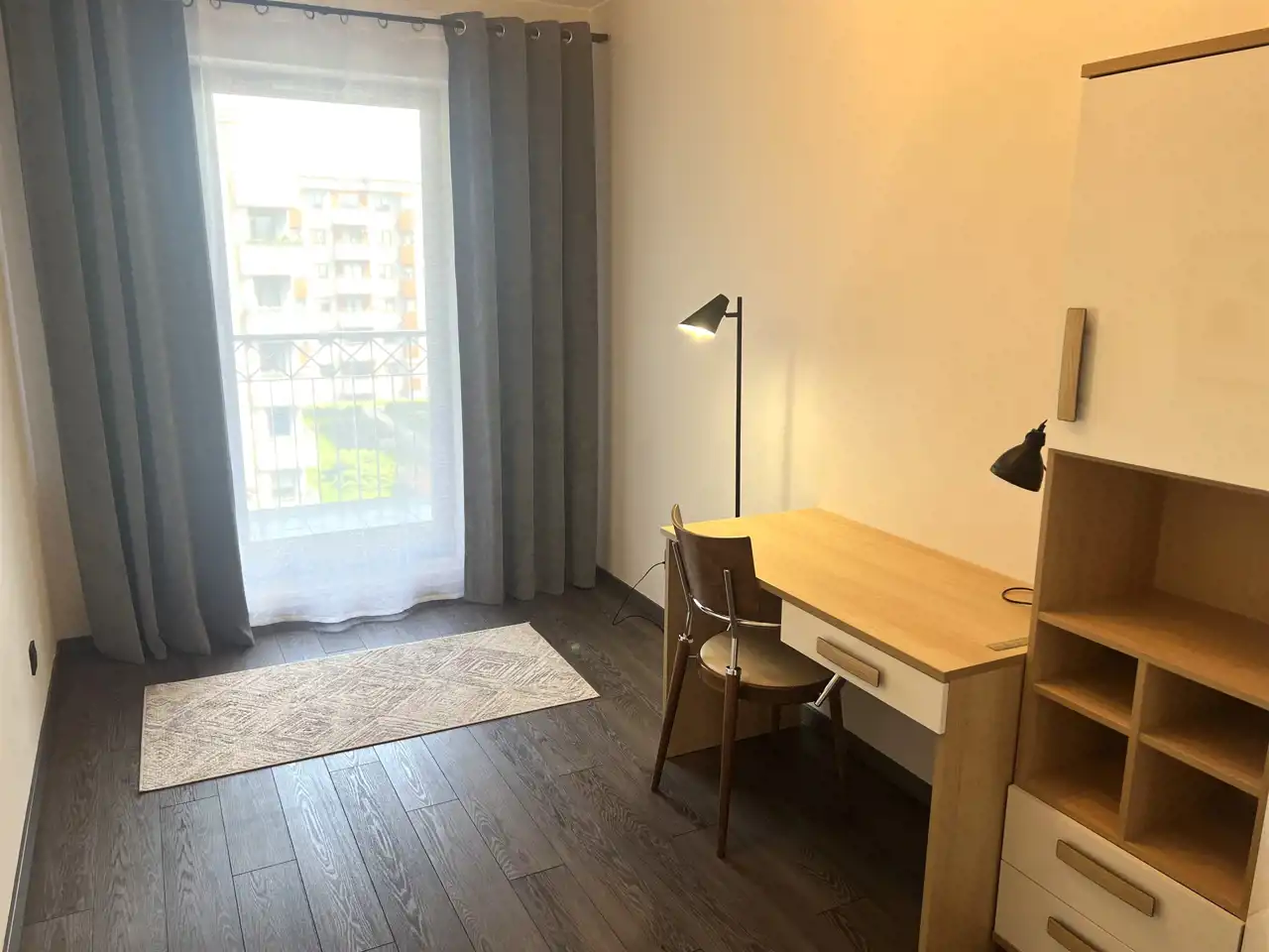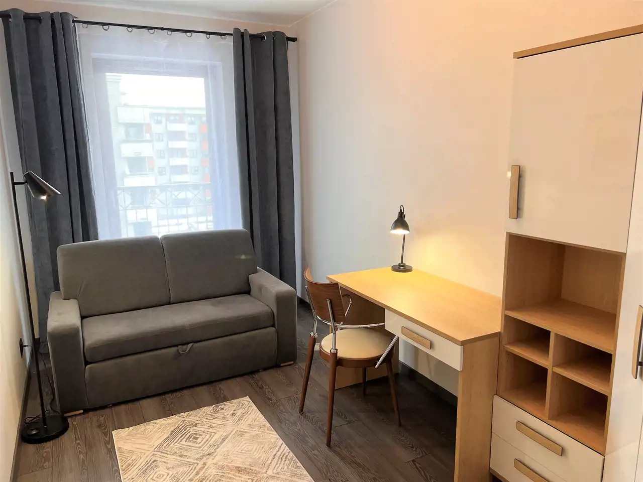 - DRUGA SYPIALNIA/GABINET: 10,33 m2, biurko z krzesłem, regał narożny, wyjście na bardzo duży balkon z widokiem na park, UWAGA !- na życzenie Najemców może być wstawiona kanapa rozkładana (widoczna na zdjęciu),