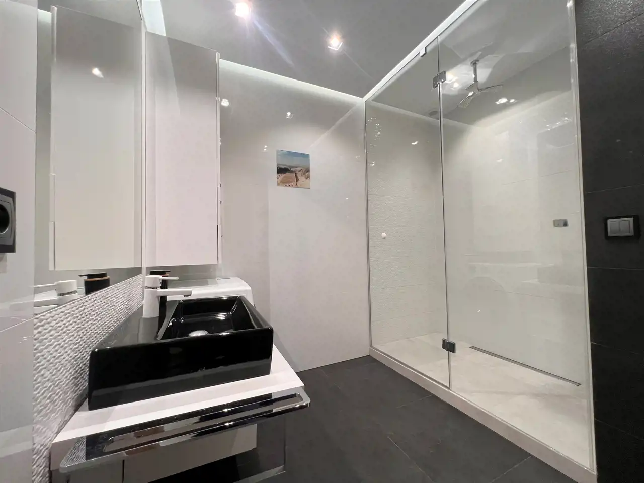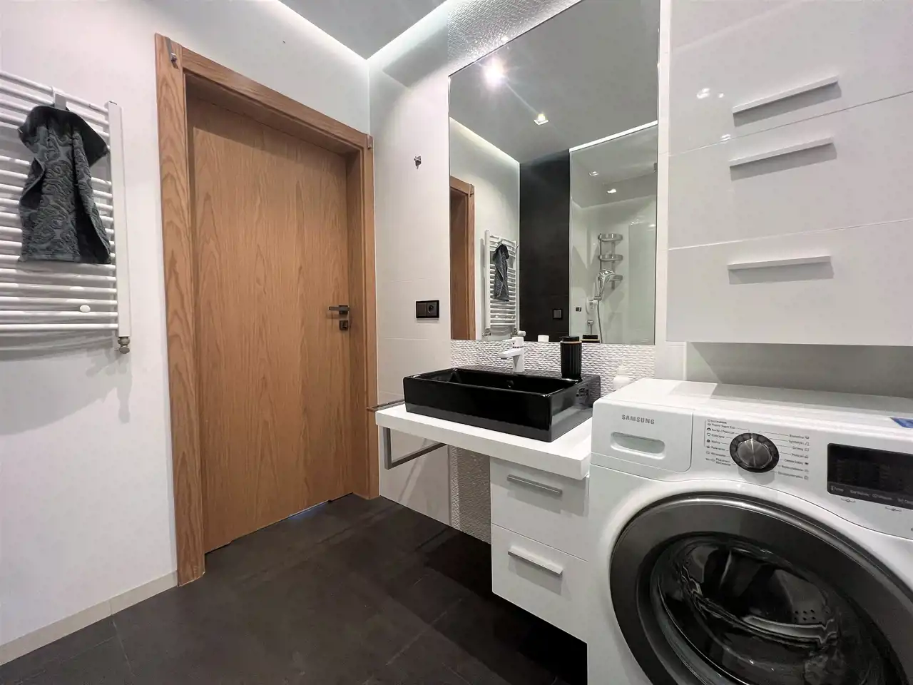 - ŁAZIENKA: 5,48 m2, duża kabina prysznicowa z oświetleniem, umywalka nablatowa z dużym lustrem, szafka łazienkowa, pralka,