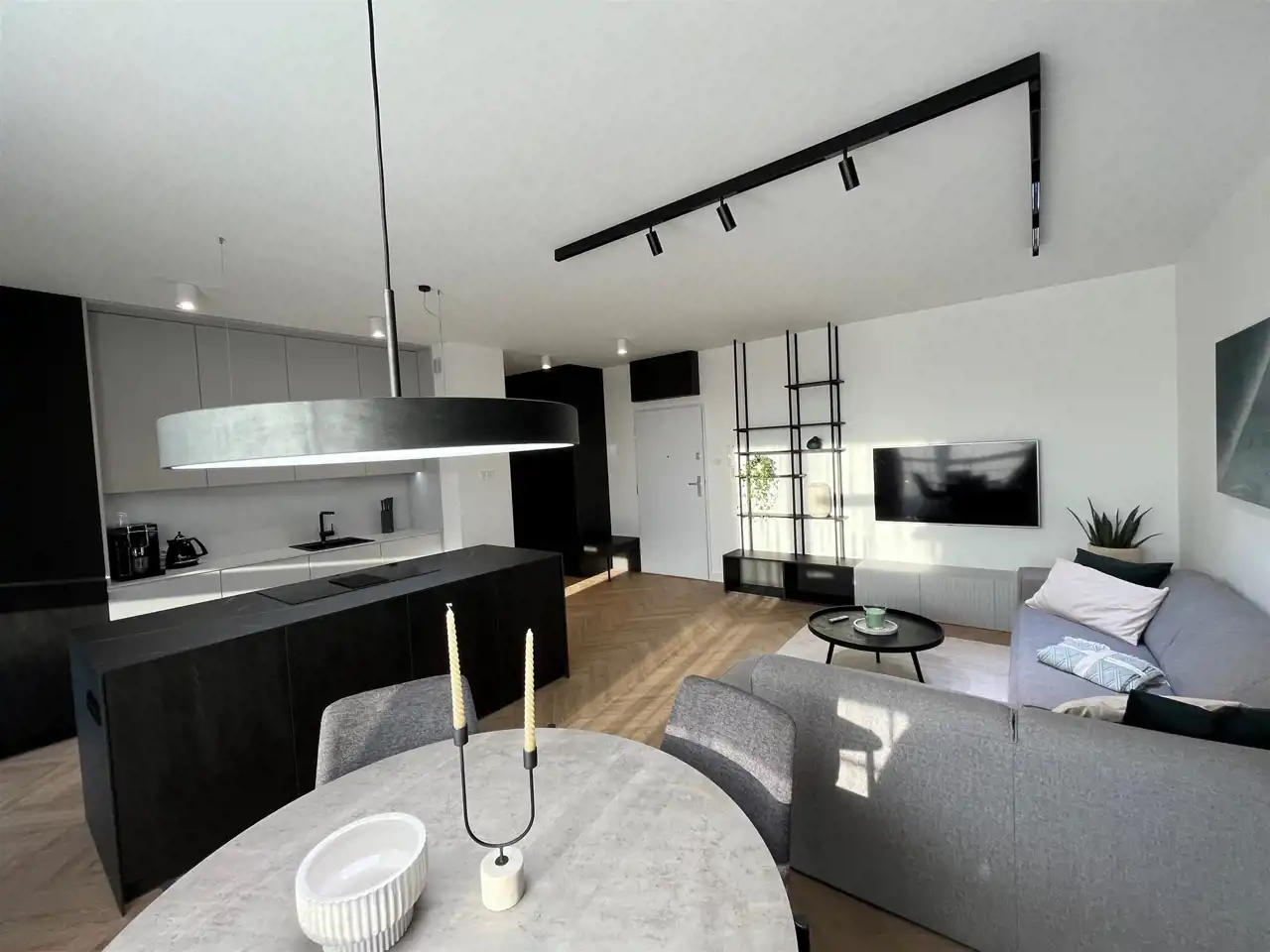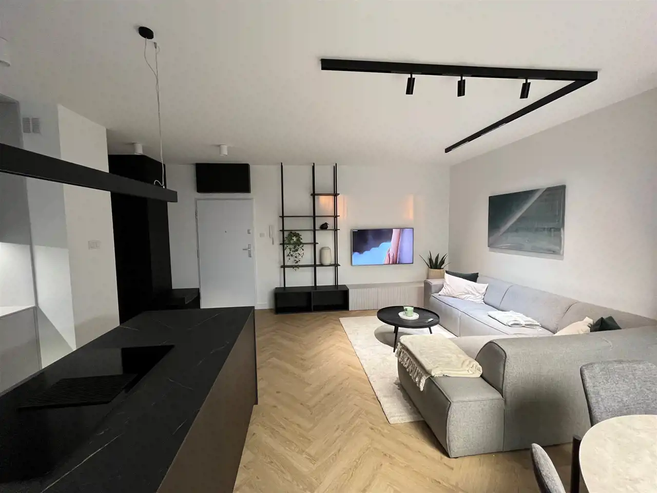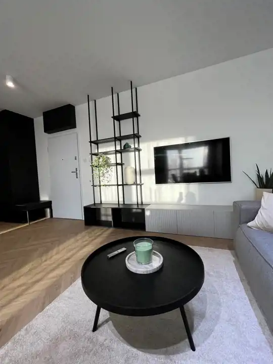 Przestronny salon umeblowany został w wygodną kanapę, stół z krzesłami, szafkę RTV, telewizor Samsung 55'. Aneks kuchenny wyposażony we wszystkie niezbędne sprzęty (zmywarka, płyta indukcyjna, kuchenka mikrofalowa, piekarnik elektryczny, lodówko-zamrażarka, ekspres do kawy DeLonghi). Sypialnia z wygodnym podwójnym łóżkiem, pakowną szafą oraz komfortowym miejscem do pracy. Łazienka z dużym prysznicem typu walk-in, umywalką i WC. Dodatkowo w przedpokoju znajduje się oraz pojemna szafa.