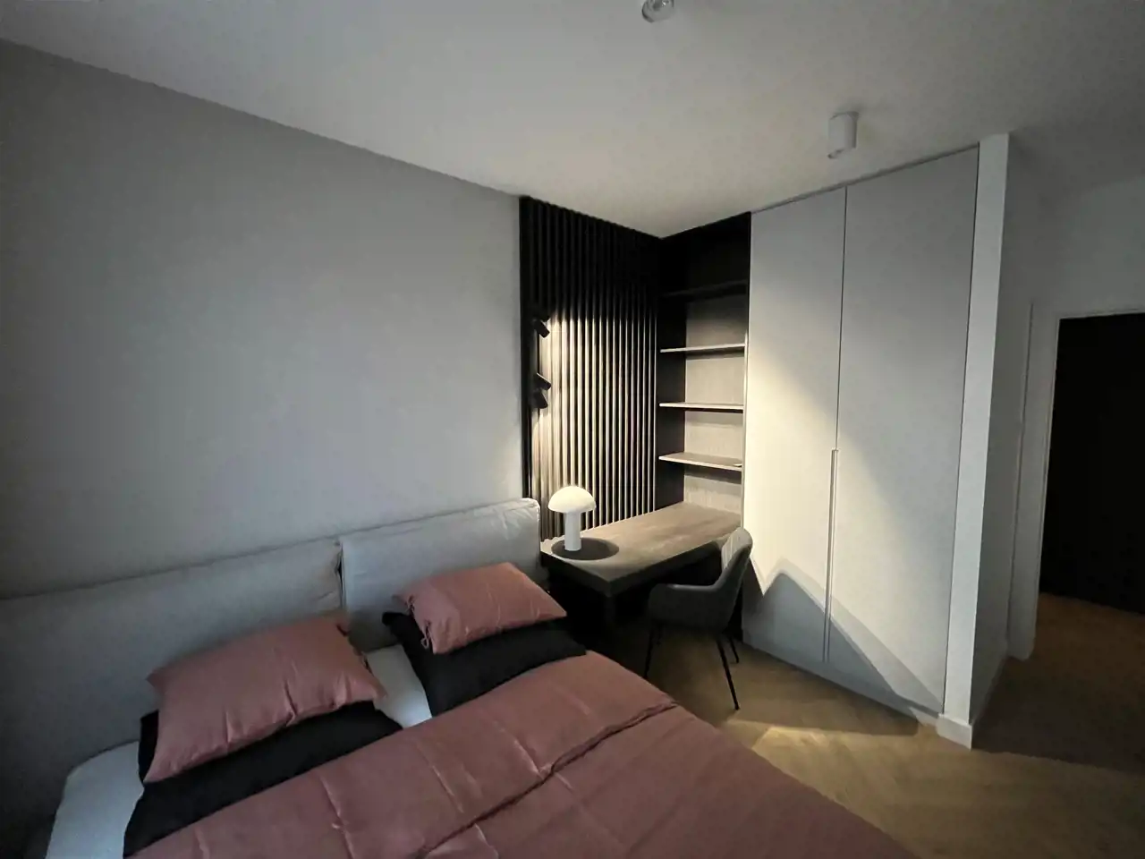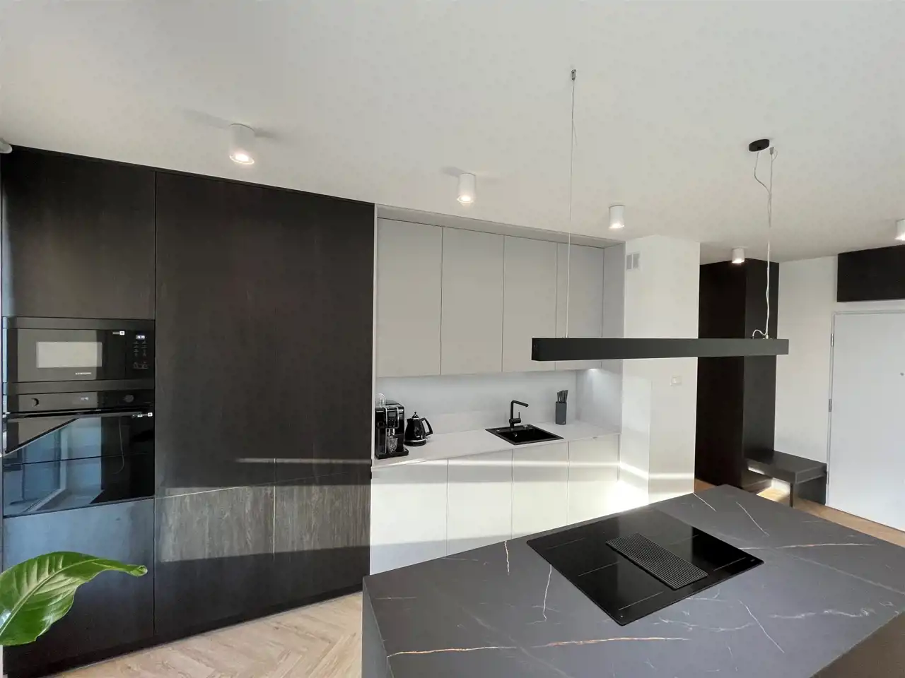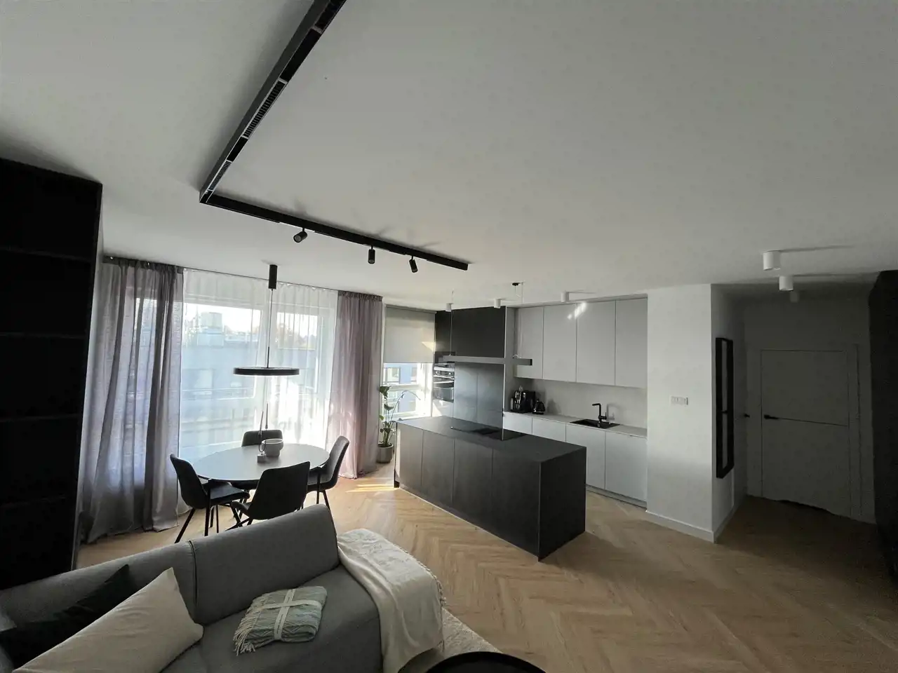 Przestronny salon umeblowany został w wygodną kanapę, stół z krzesłami, szafkę RTV, telewizor Samsung 55'. Aneks kuchenny wyposażony we wszystkie niezbędne sprzęty (zmywarka, płyta indukcyjna, kuchenka mikrofalowa, piekarnik elektryczny, lodówko-zamrażarka, ekspres do kawy DeLonghi). Sypialnia z wygodnym podwójnym łóżkiem, pakowną szafą oraz komfortowym miejscem do pracy. Łazienka z dużym prysznicem typu walk-in, umywalką i WC. Dodatkowo w przedpokoju znajduje się oraz pojemna szafa.