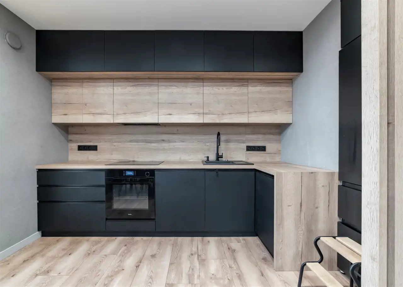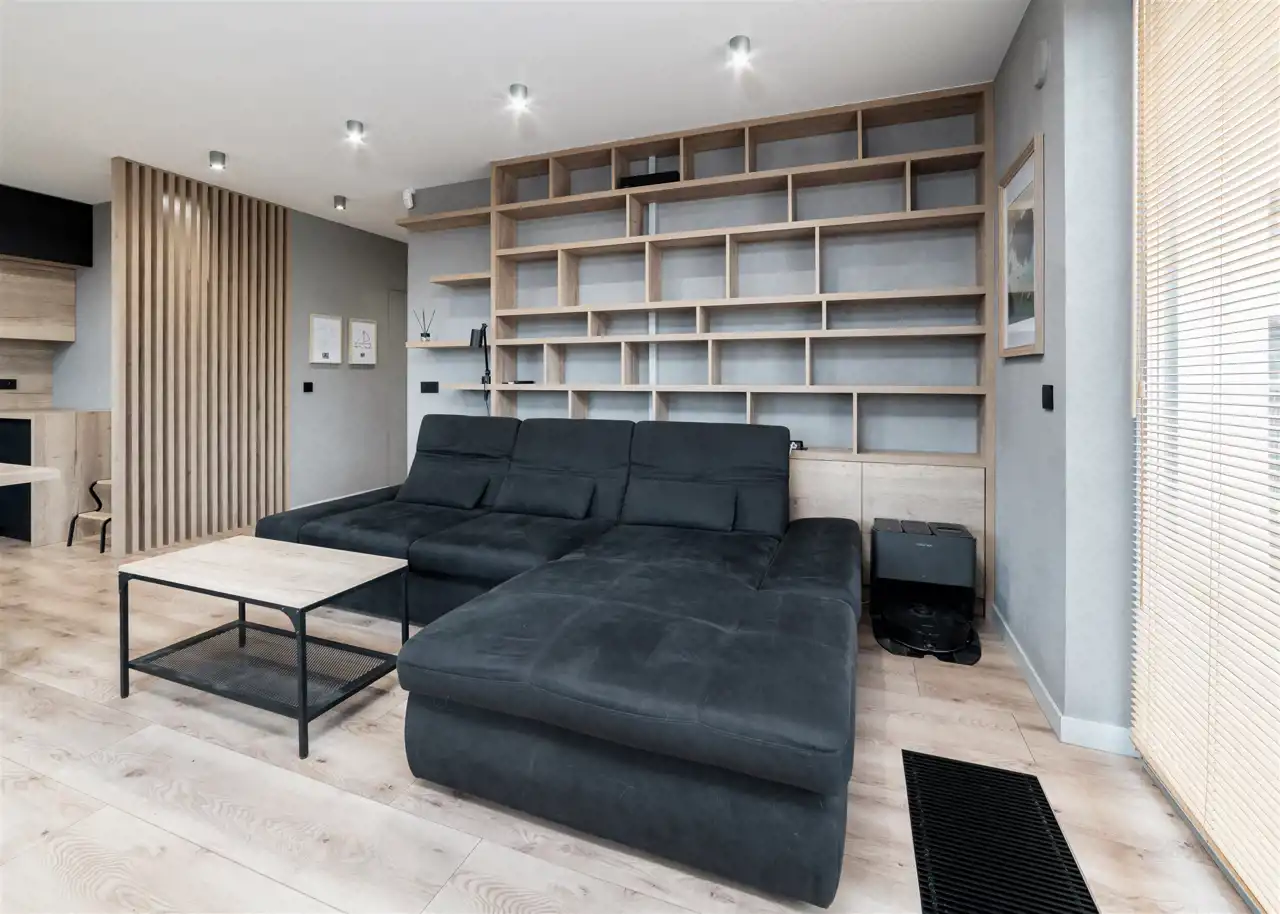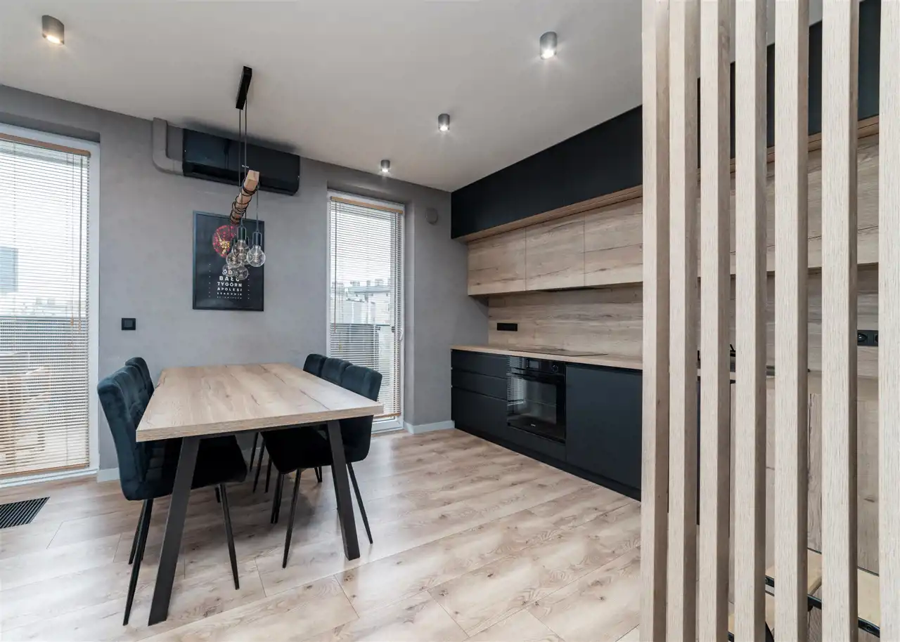 - funkcjonalny aneks kuchenny w pełni wyposażony w zmywarkę, lodówko-zamrażarkę, piekarnik, płytę indukcyjną z okapem;