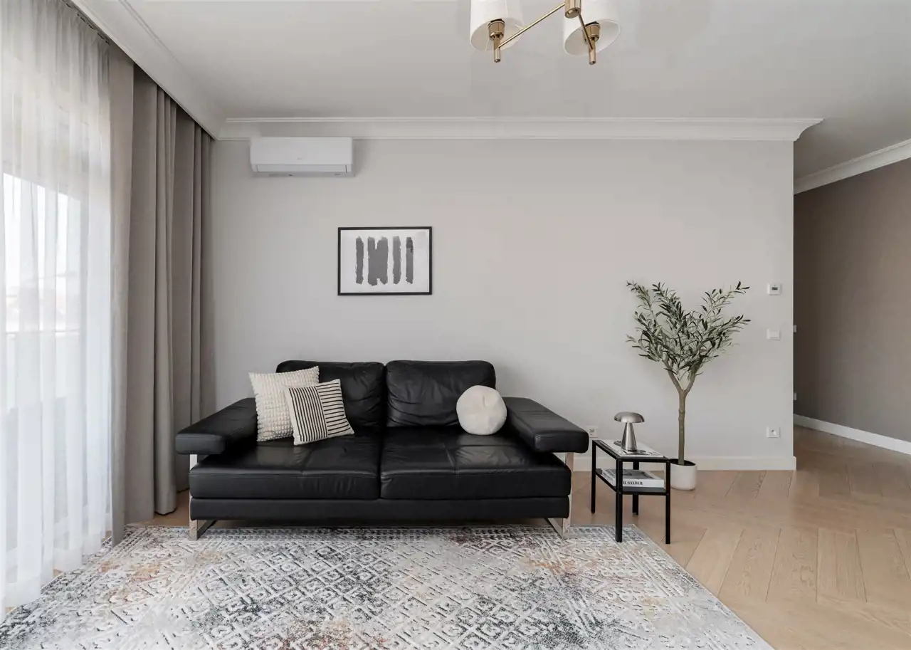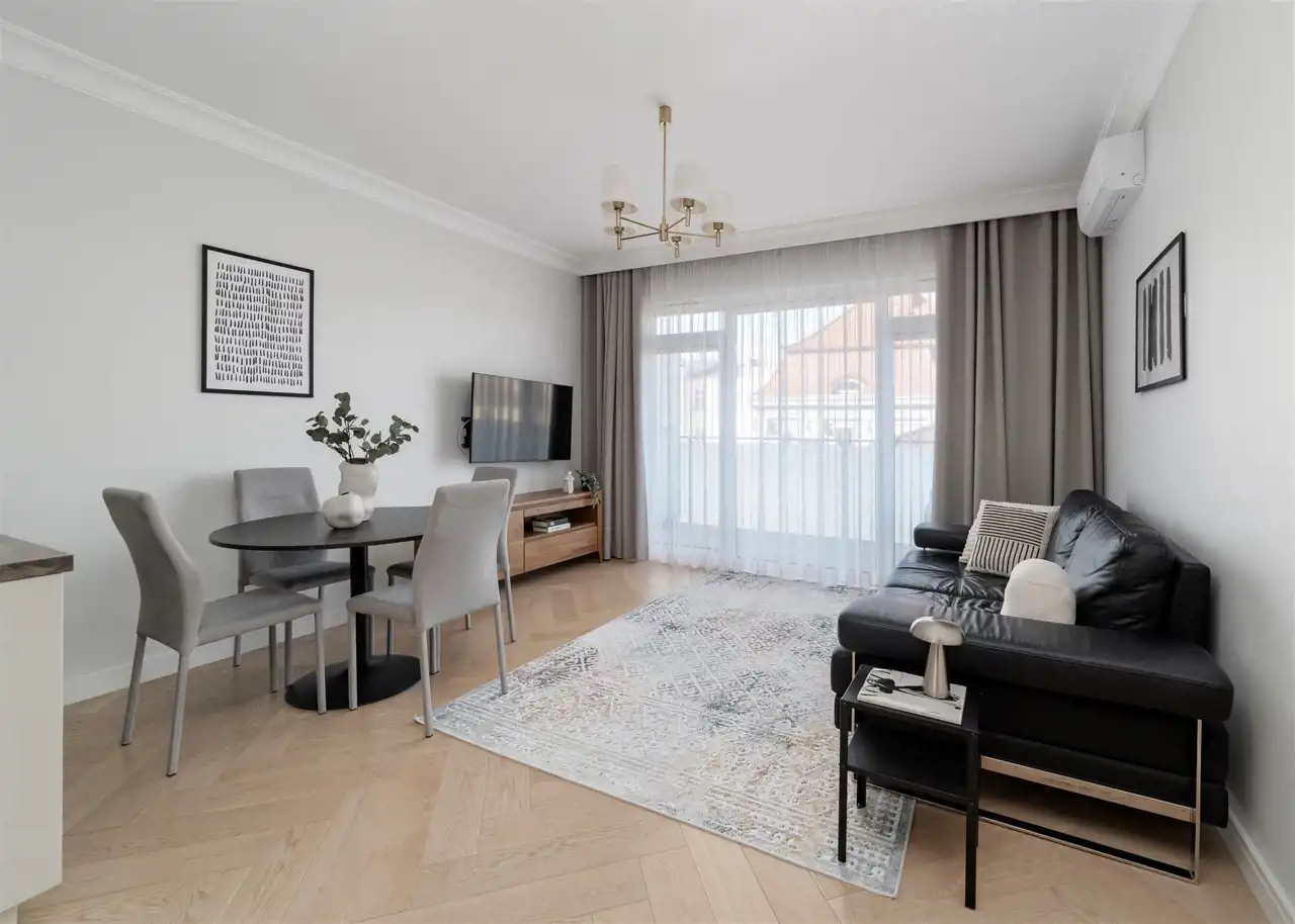 - słoneczny, ale klimatyzowany salon (wyposażony w bardzo wygodną skórzaną kanapę, stół z 4 krzesłami i TV) z wyjściem na duży balkon;