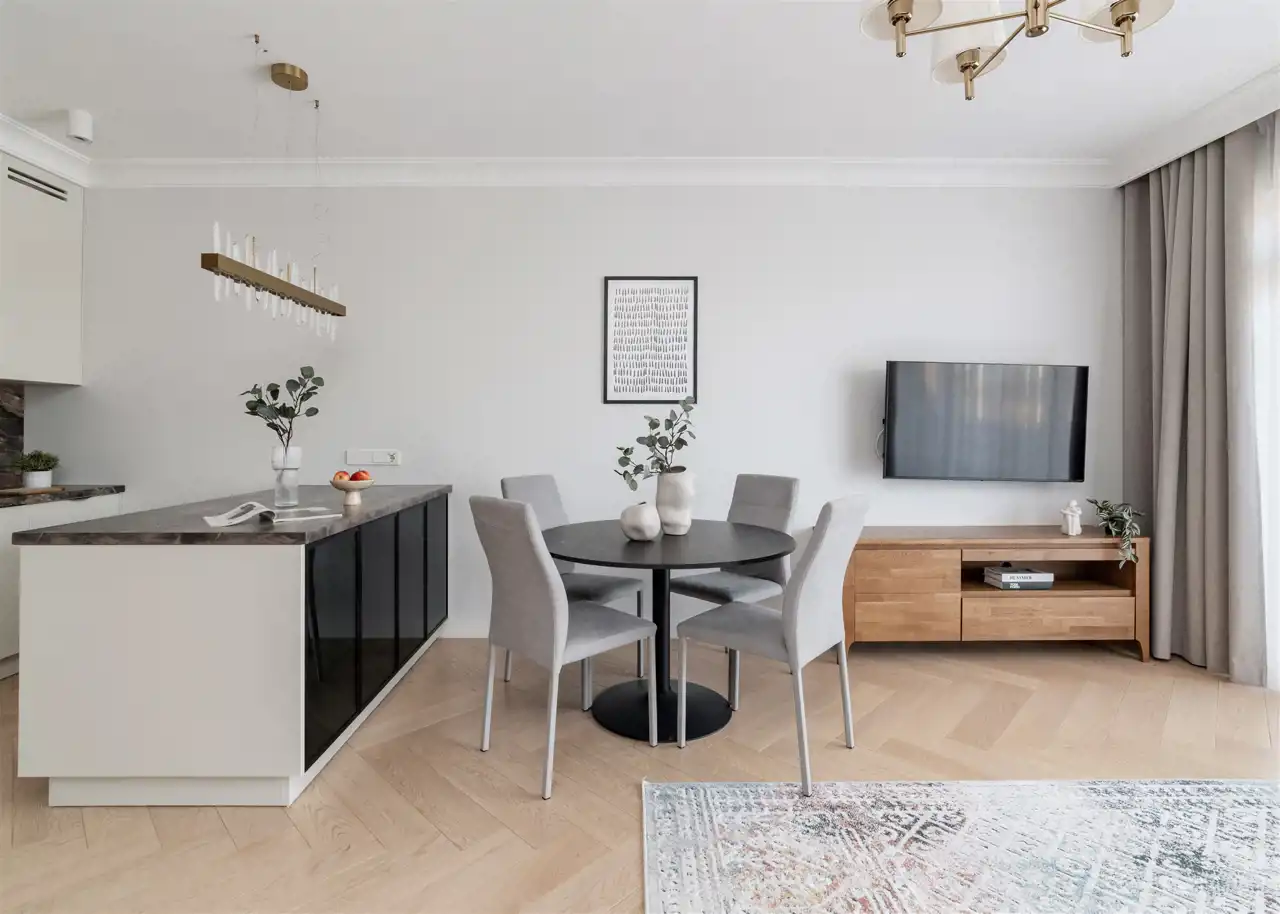 - aneks kuchenny z wyspą (wyposażony w płytę indukcyjną, okap, piekarnik, lodówkę z zamrażarką, zmywarkę oraz drobne wyposażenie kuchenne);