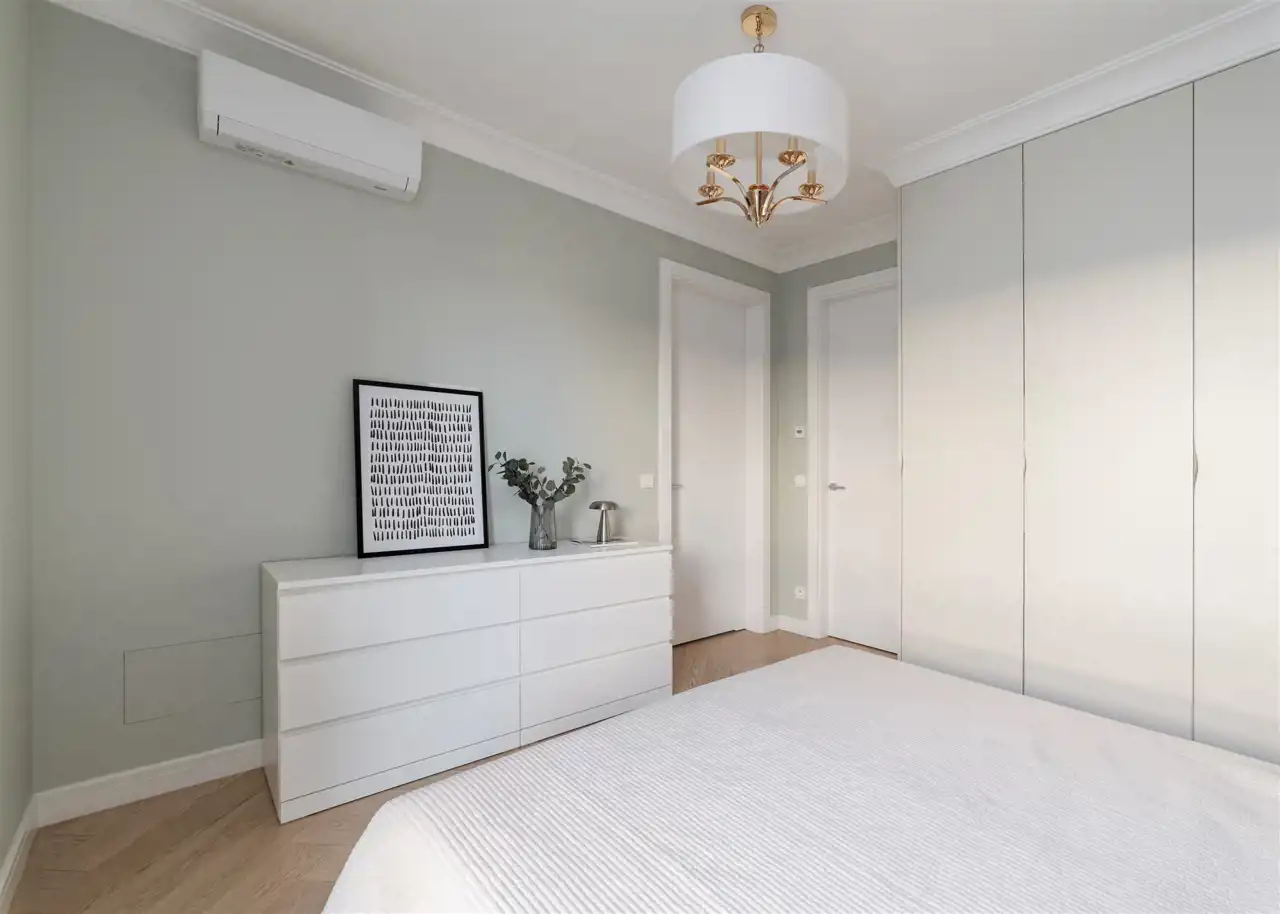 - klimatyzowaną główną sypialnię z wejściem do łazienki wyposażoną w łóżko małżeńskie pojemną szafę;