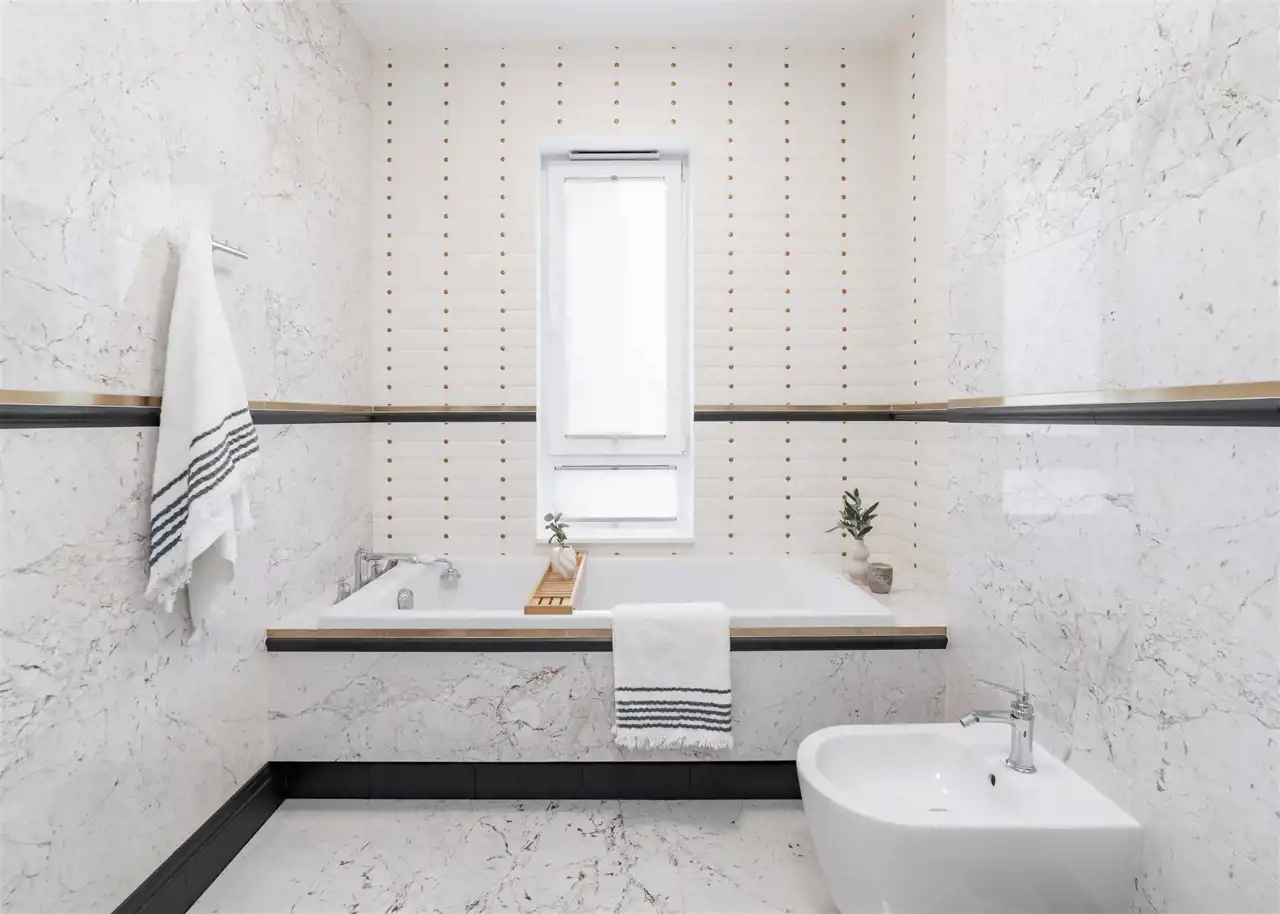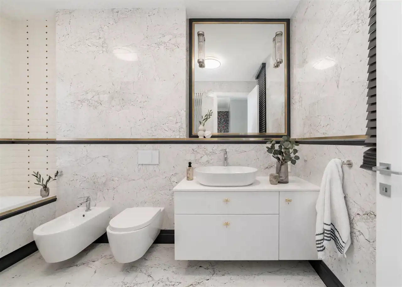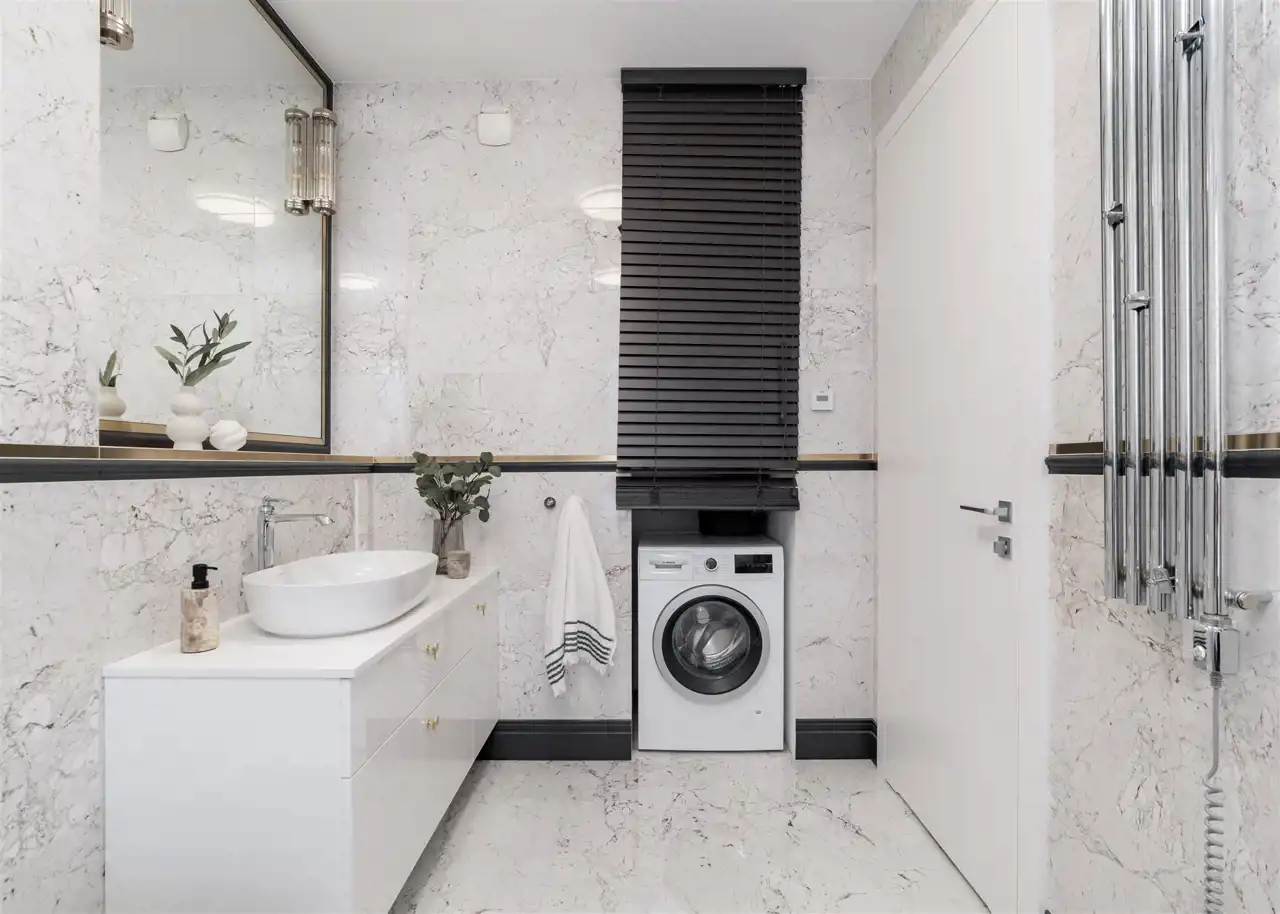 - łazienkę z WC wyposażoną w wannę, bidet oraz pralkę;