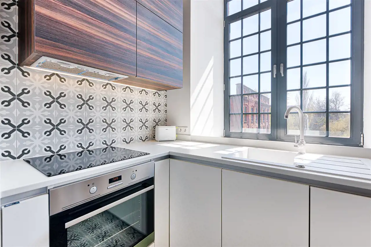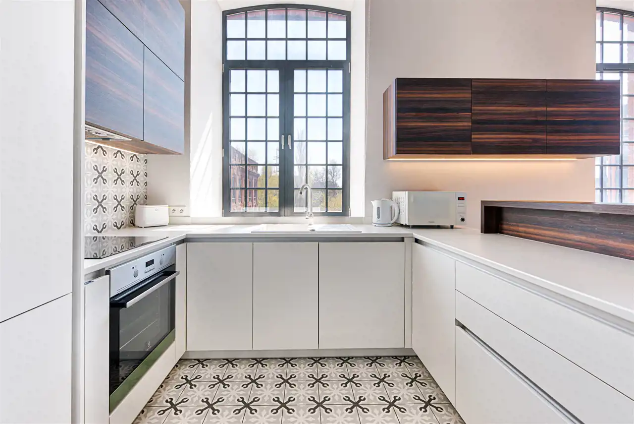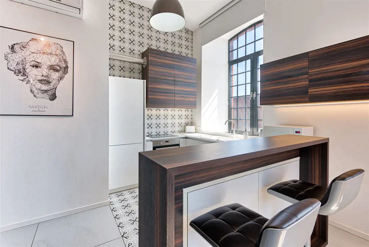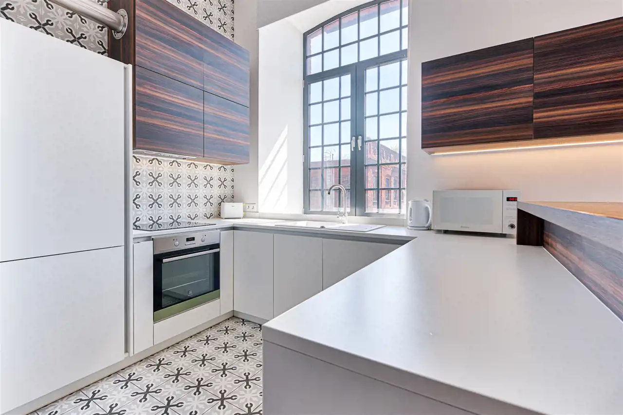 - Kompletnie wyposażony aneks kuchenny (płyta grzewcza, piekarnik, okap, zmywarka, lodówka z zamrażarką);