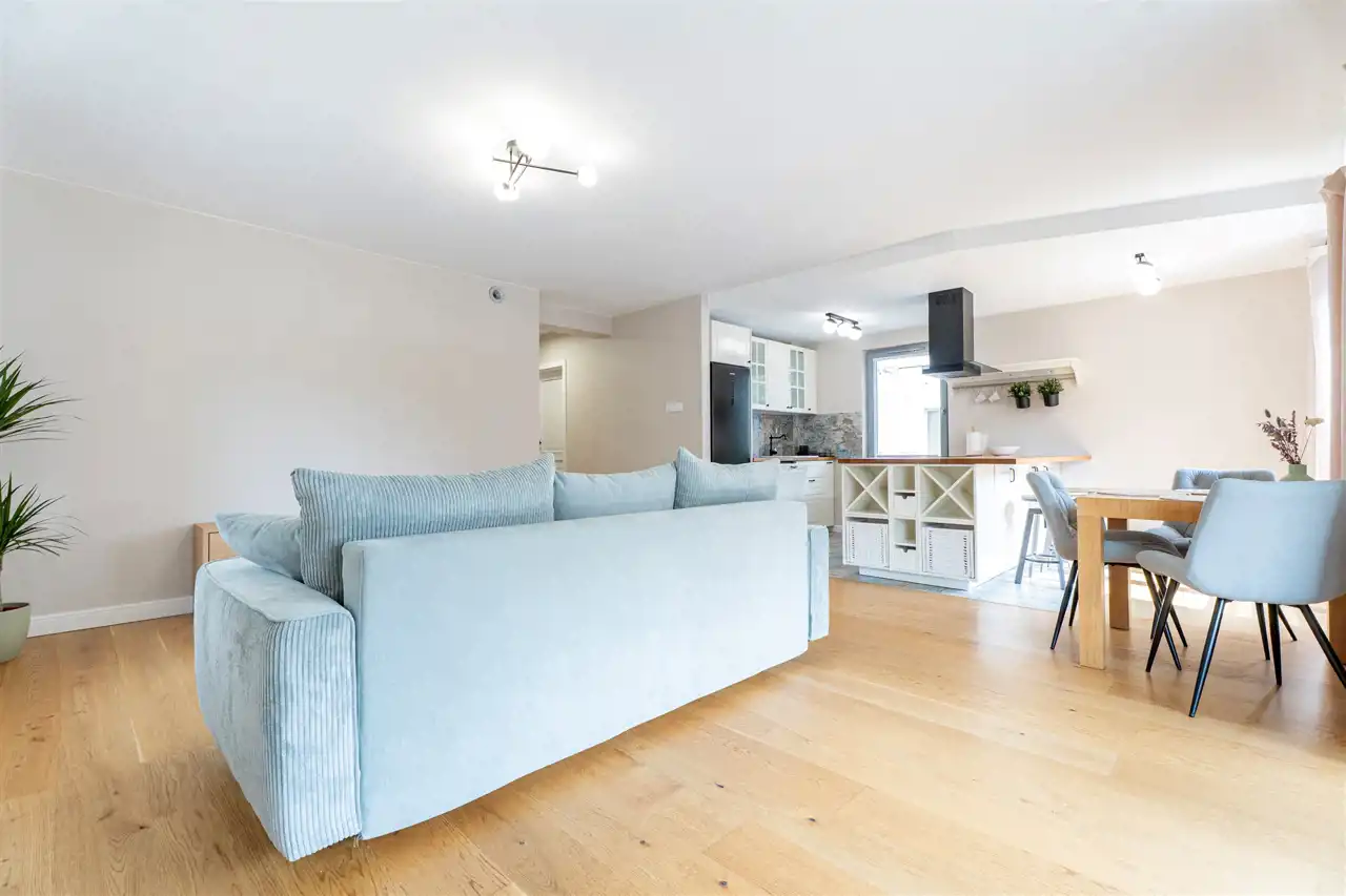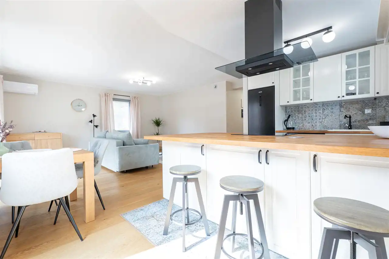Przestronny salon z aneksem kuchennym i wyspą. To idealne miejsce do relaksu, wyposażone w nowe meble, wygodną kanapę i klimatyzację. Z salonu jest bezpośrednie wyjście na ogromny, zadaszony taras z rozwijaną markizą.