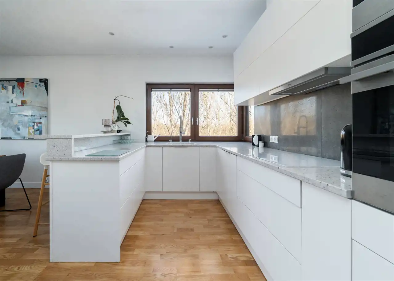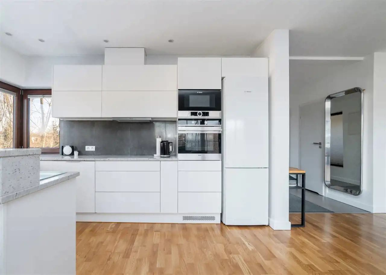 - kompletnie wyposażony aneks kuchenny (płyta indukcyjna, okap, piekarnik, mikrofala, zmywarka, lodówko-zamrażarka);