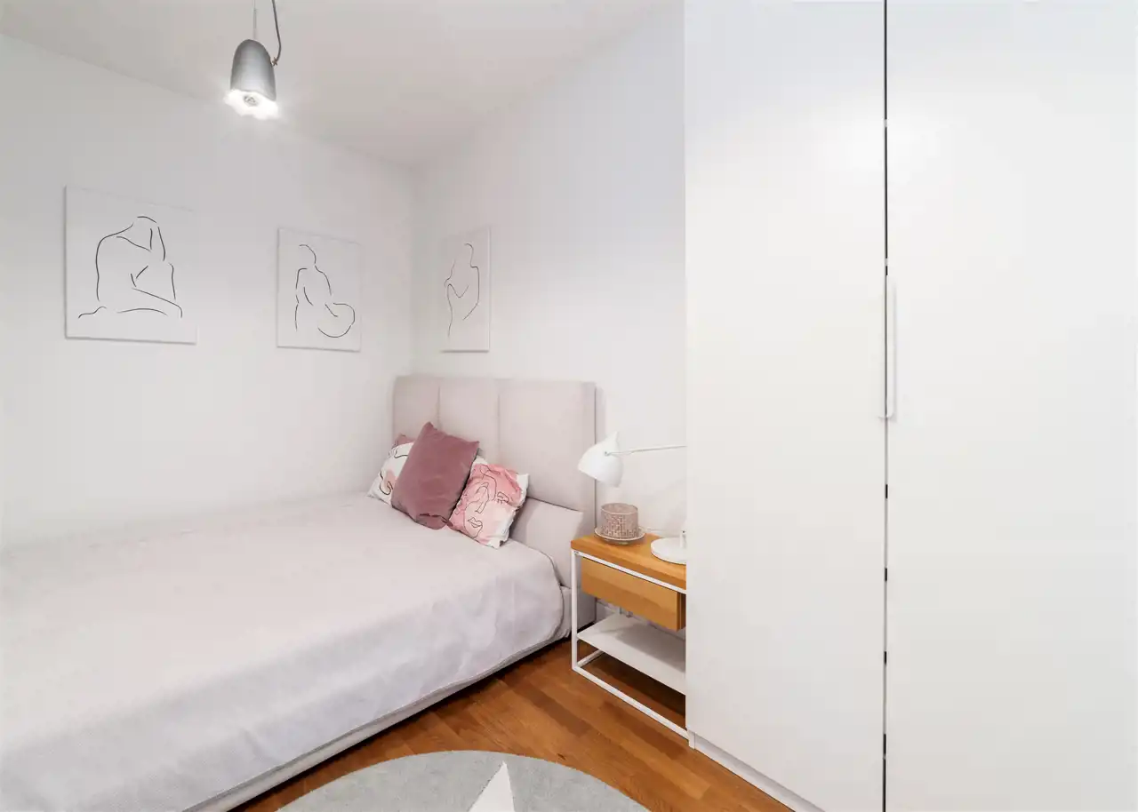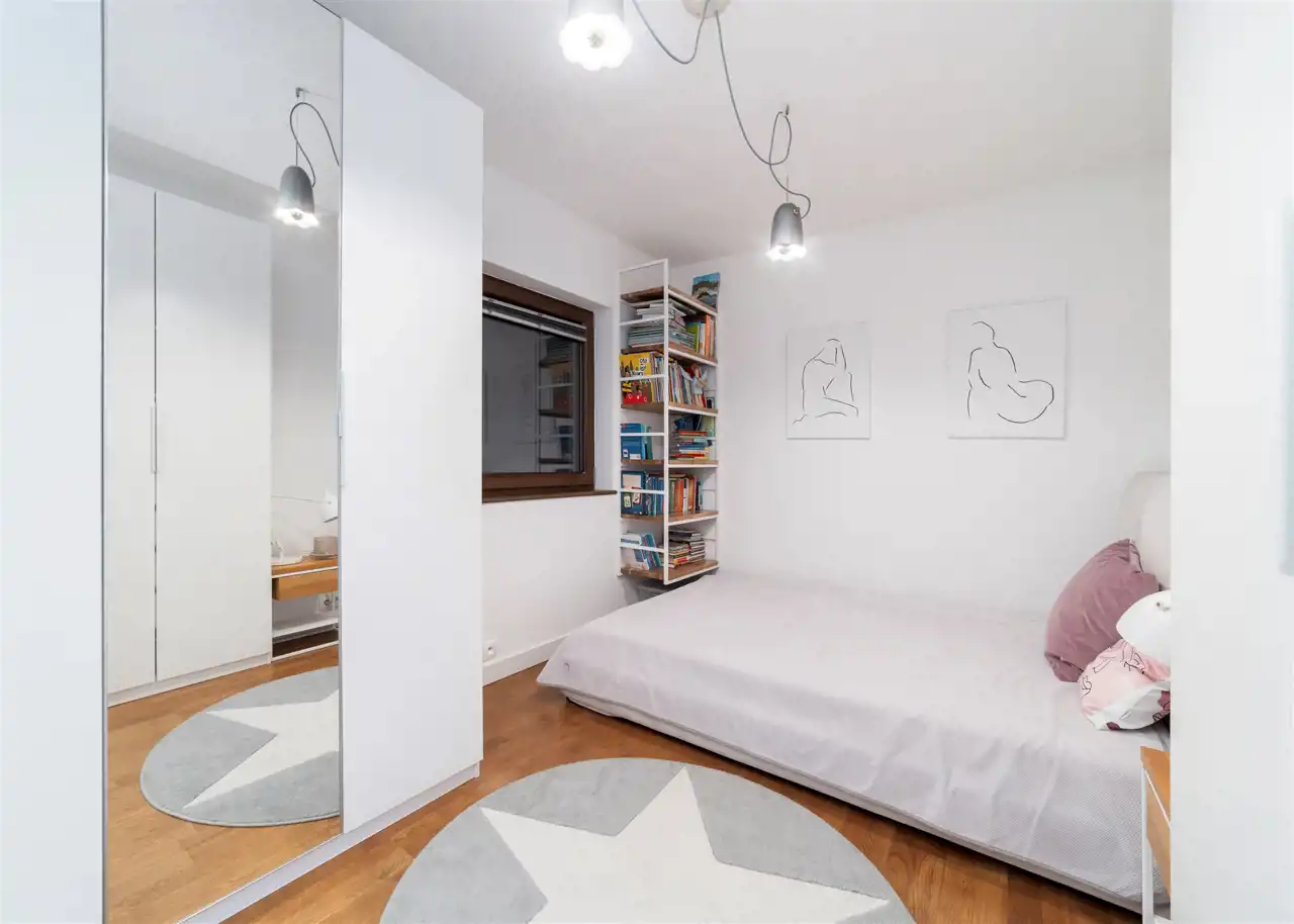- główna sypialnia z dużym łóżkiem, regałem na książki i pojemnymi szafami;