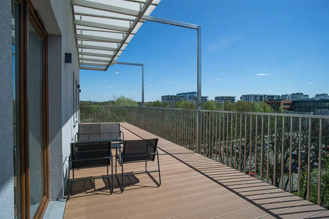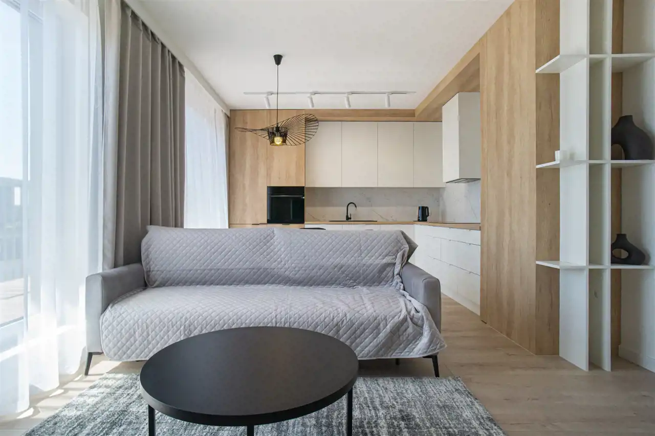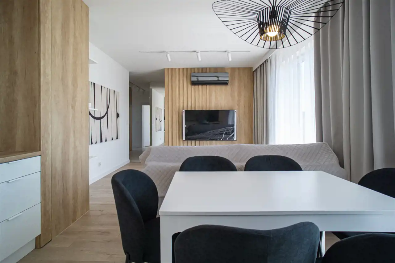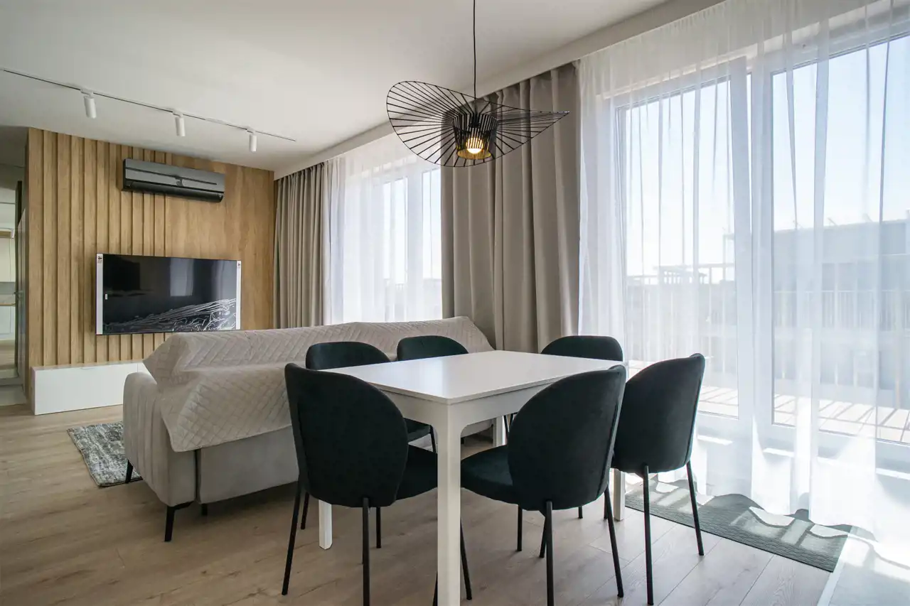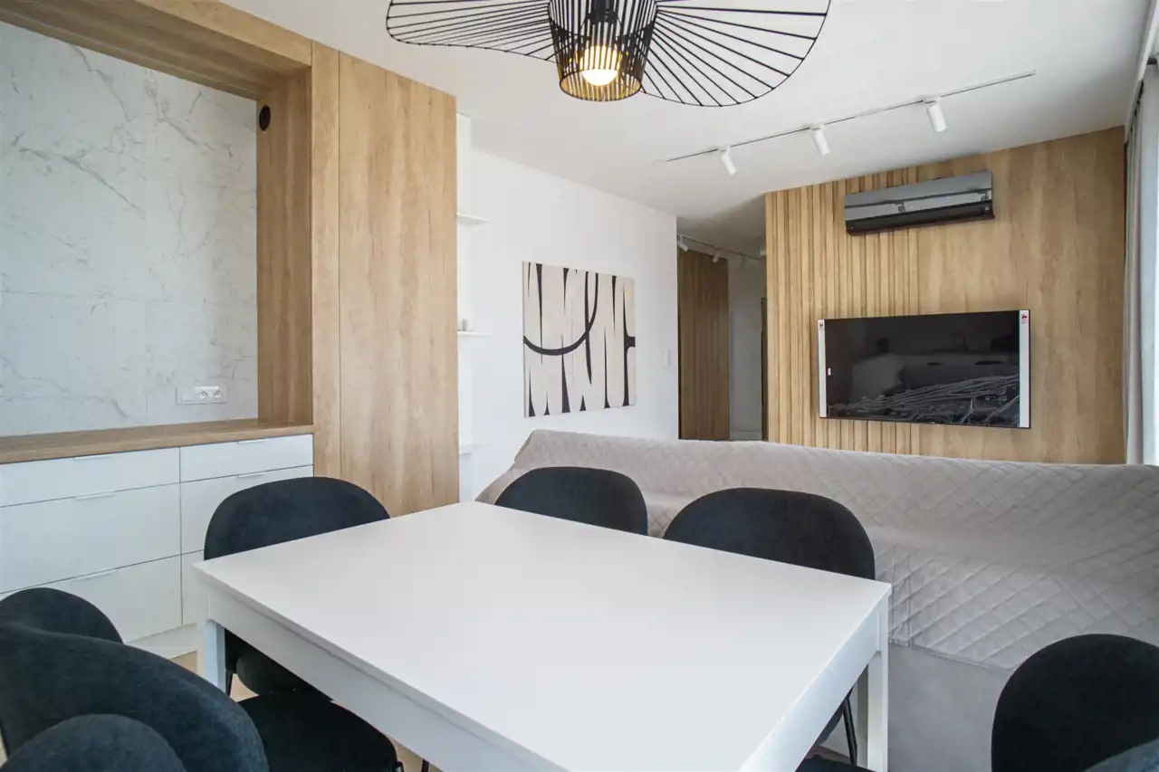 W salonie kanapa, stolik i TV oraz wyjście na ogromny taras z widokiem na miasteczko studenckie. Przy salonie aneks kuchenny, wyposażony w wysokiej jakości sprzęty i gustowne meble. Stół z krzesłami przy aneksie. W salonie Klimatyzacja.