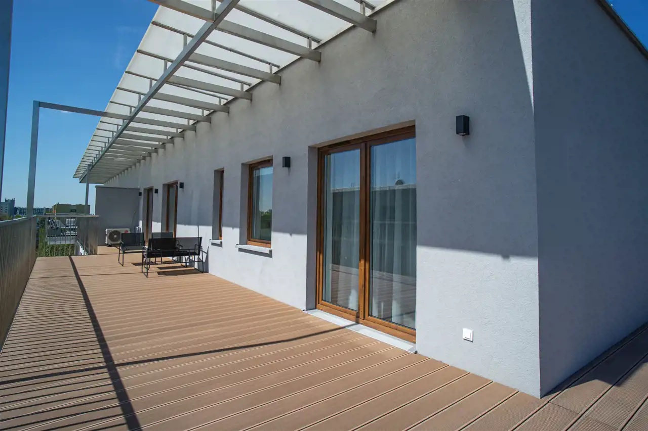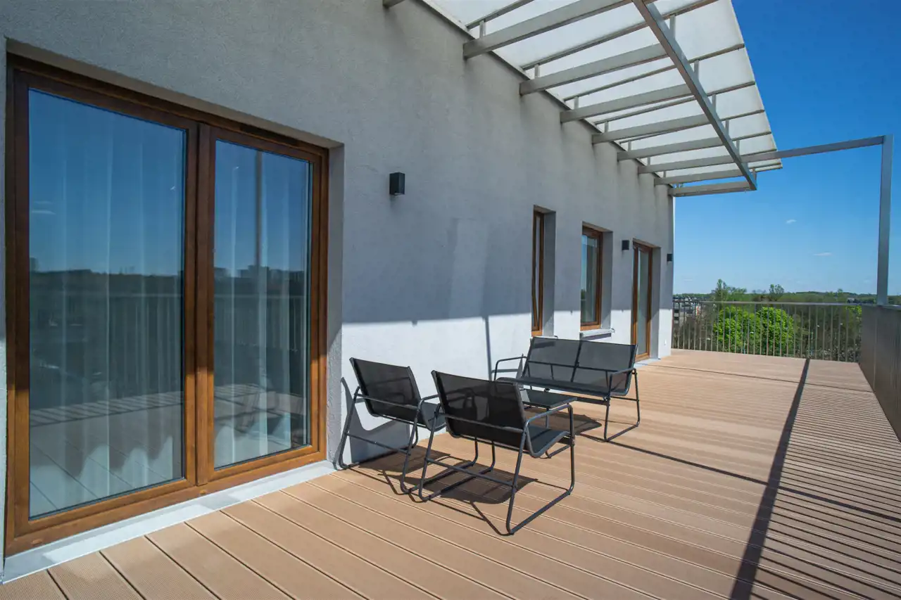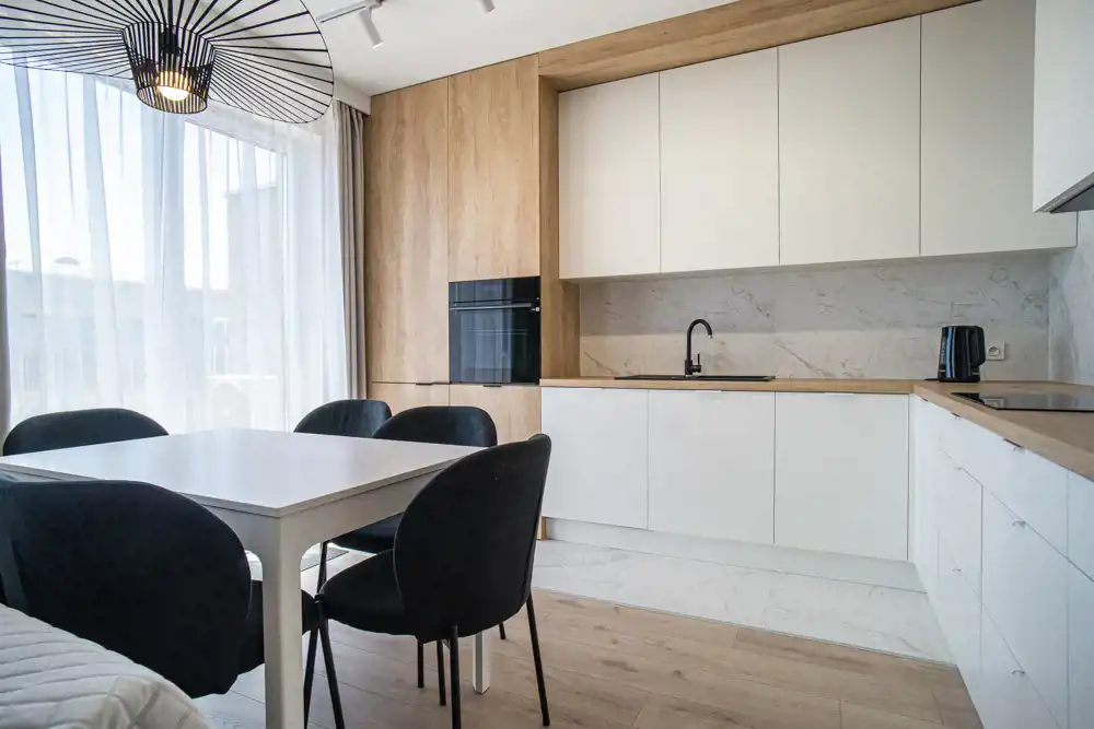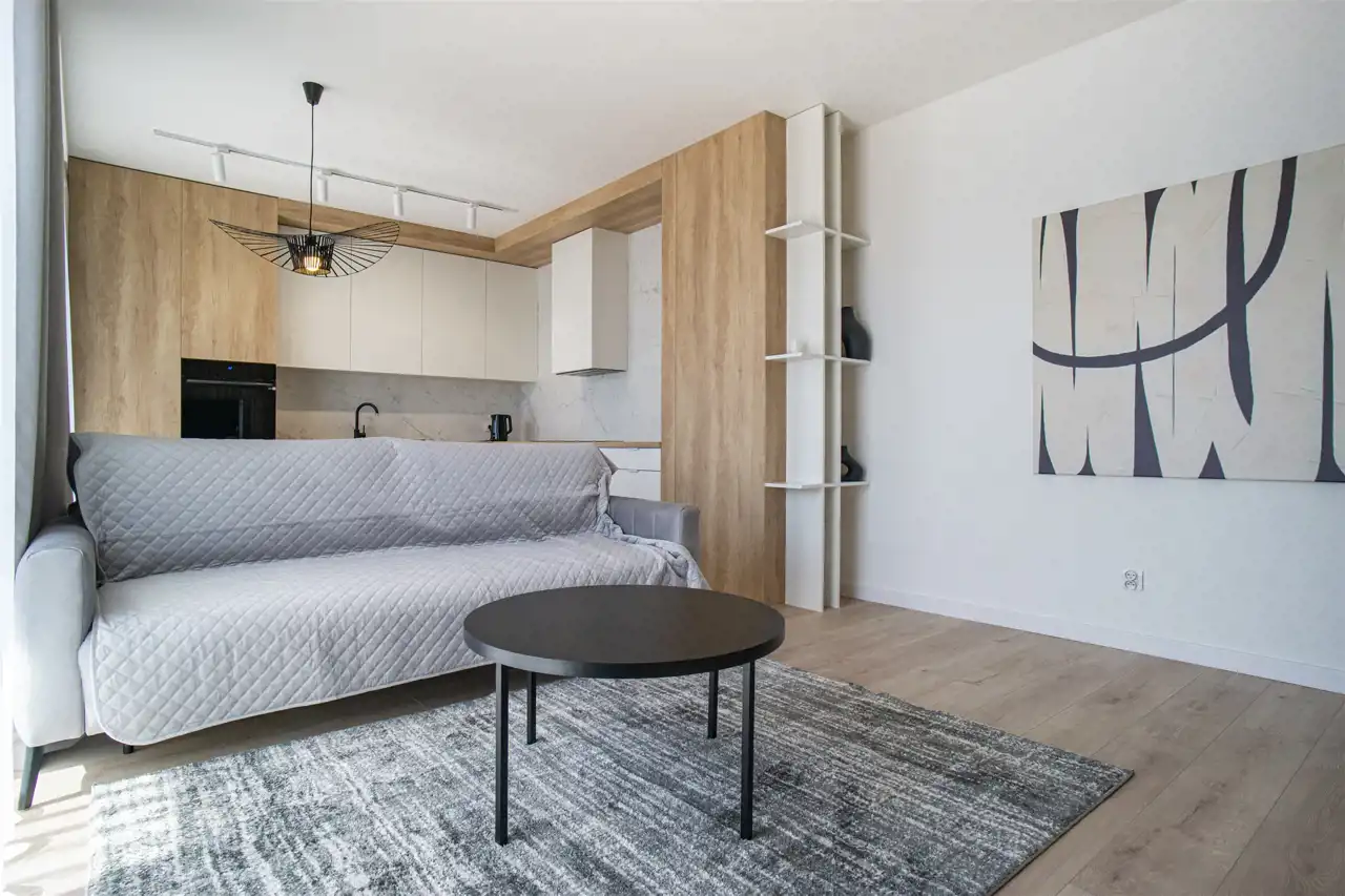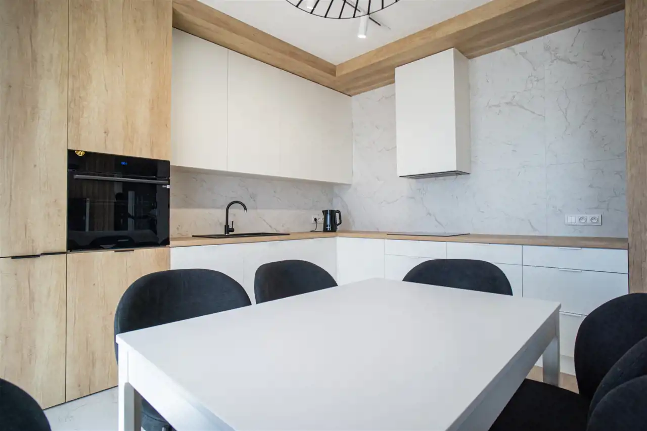 W salonie kanapa, stolik i TV oraz wyjście na ogromny taras z widokiem na miasteczko studenckie. Przy salonie aneks kuchenny, wyposażony w wysokiej jakości sprzęty i gustowne meble. Stół z krzesłami przy aneksie. W salonie Klimatyzacja.