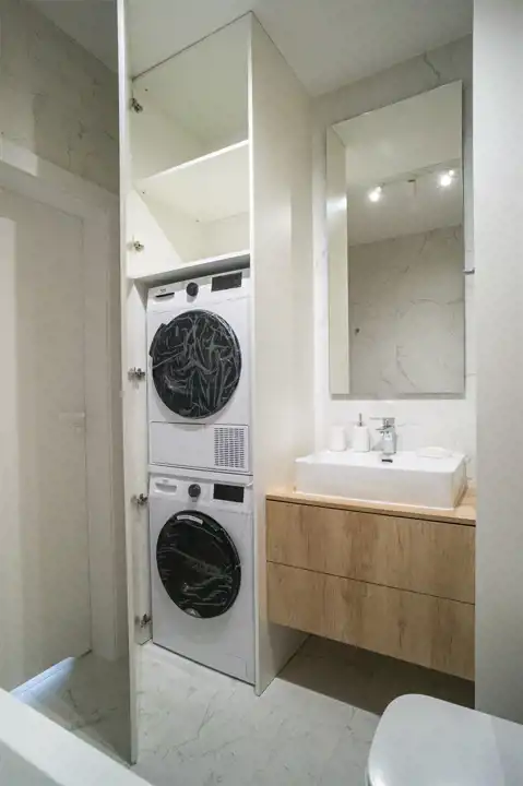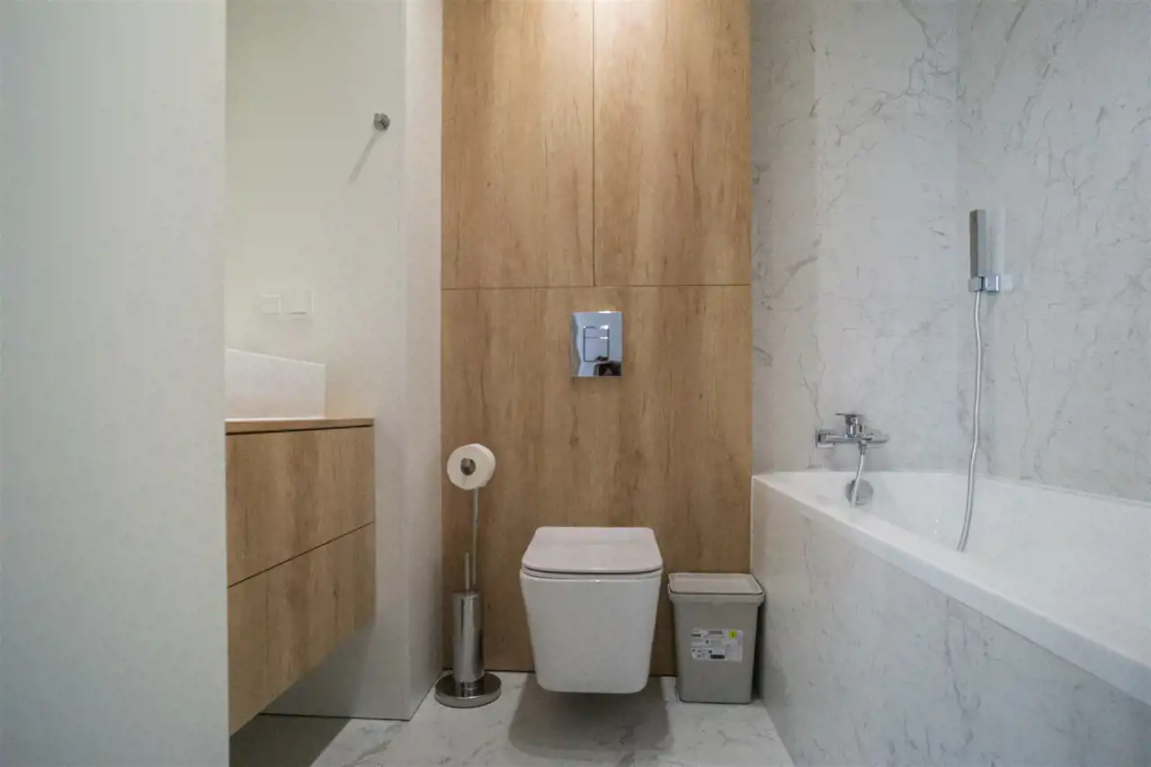 Apartament posiada dwie łazienki, pierwsza z wanną, WC, umywalką i pralką i suszarką w zabudowie. druga posiada ogromny prysznic, WC i umywalką. Łazienka zadbana i czysta, urządzona w stylu podobnym do reszty mieszkania.