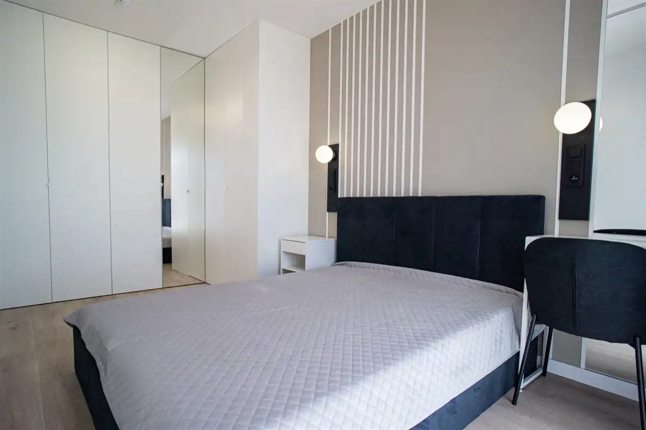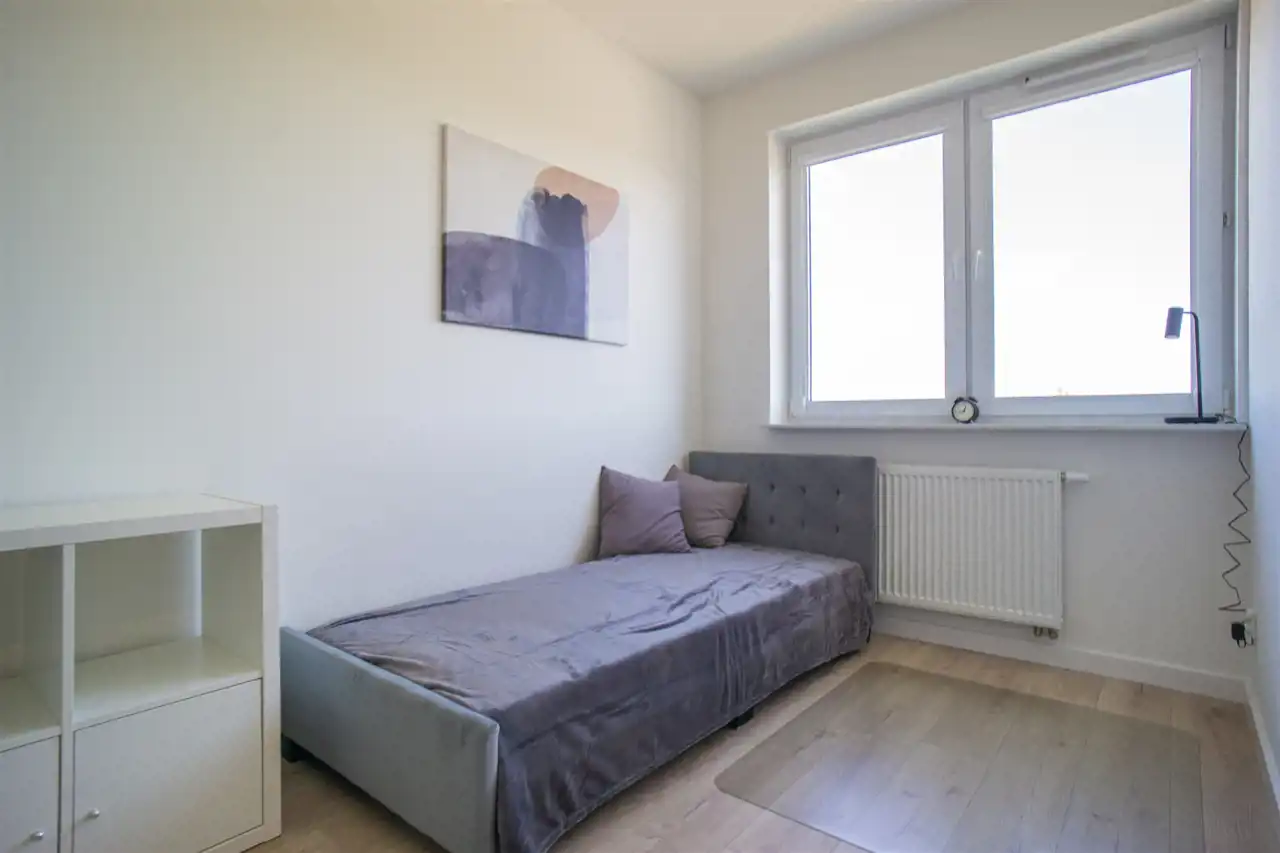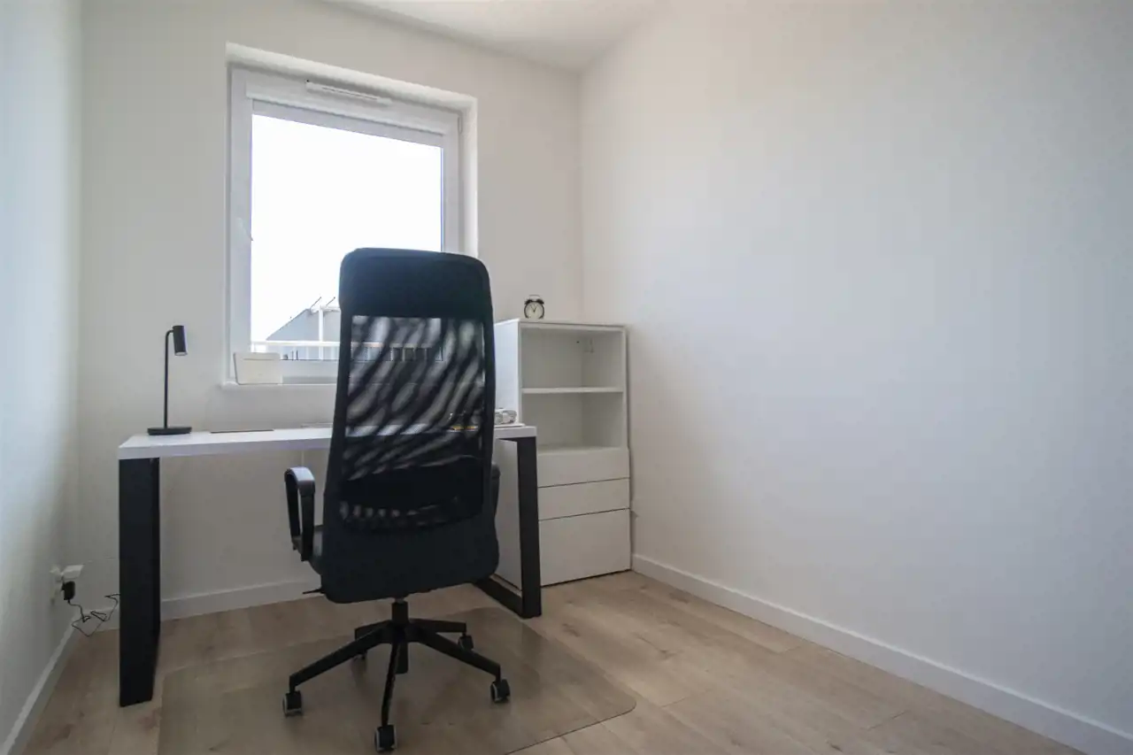 Do tego dwa pokoje sypialne, jeden wyposażony w komfortowe łóżko dwuosobowe oraz zabudowy i toaletkę, drugi w pojedyncze łóżko oraz biurko. Ostatni pokój wyposażony w biurko do pracy zdalnej, możliwość rearanżacji pomieszczeń.