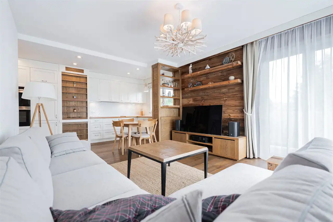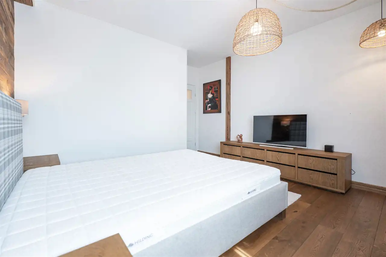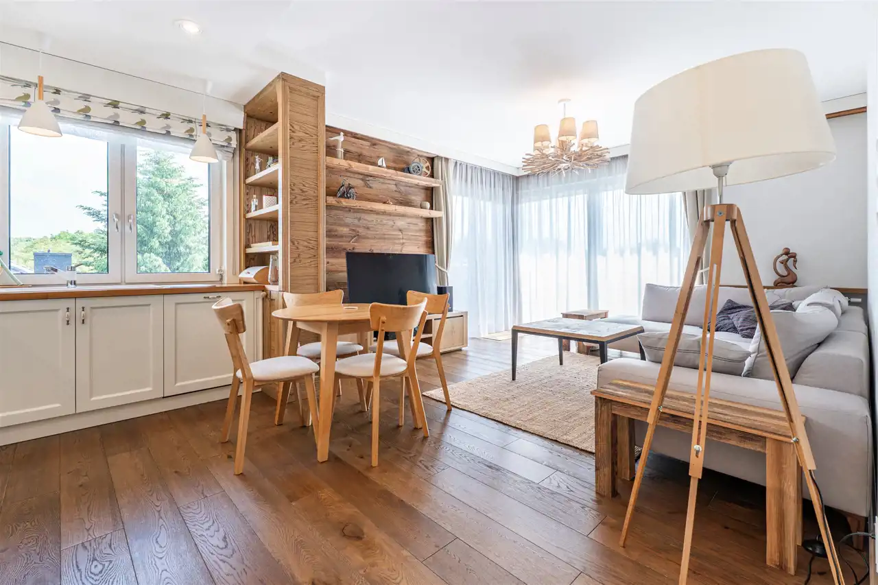 Mieszkanie o przemyślanym rozkładzie, mieści się w nowoczesnym apartamentowcu i charakteryzuje się bardzo wysokim standardem wykończenia. Wnętrza są niezwykle przytulne i komfortowe, a to za sprawą dominujących elementów drewnianych oraz eleganckiej drewnianej podłogi, ze specjalnie suszonego, ponad 100-letniego drewna, które nadają wnętrzom ciepła i klasy.