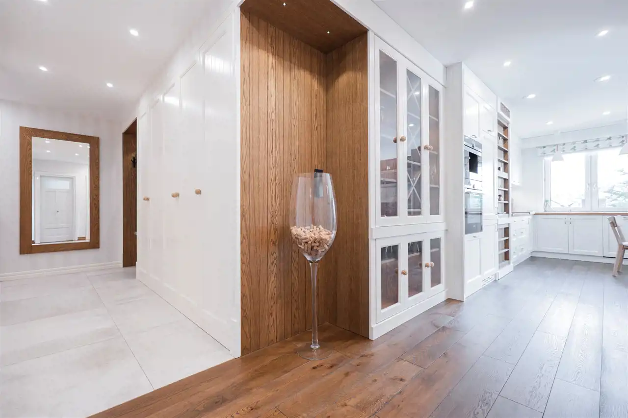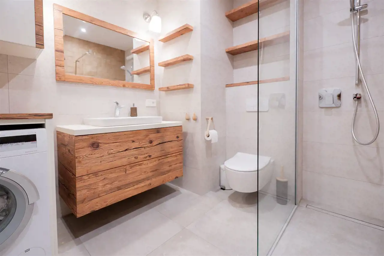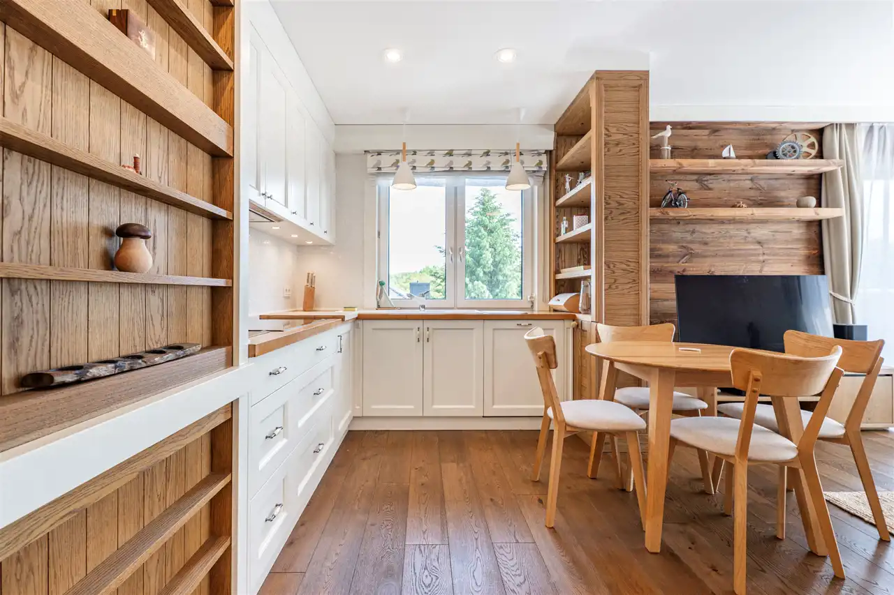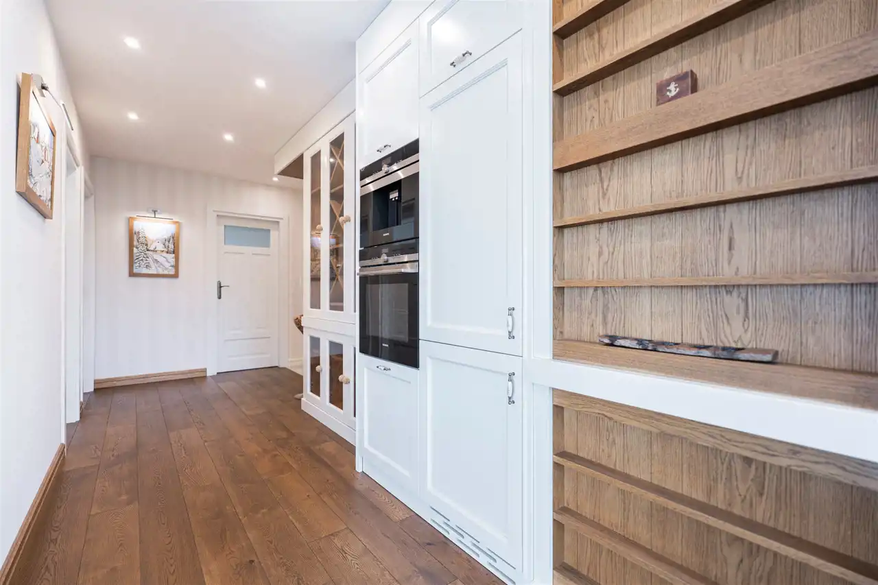 Mieszkanie o przemyślanym rozkładzie, mieści się w nowoczesnym apartamentowcu i charakteryzuje się bardzo wysokim standardem wykończenia. Wnętrza są niezwykle przytulne i komfortowe, a to za sprawą dominujących elementów drewnianych oraz eleganckiej drewnianej podłogi, ze specjalnie suszonego, ponad 100-letniego drewna, które nadają wnętrzom ciepła i klasy.