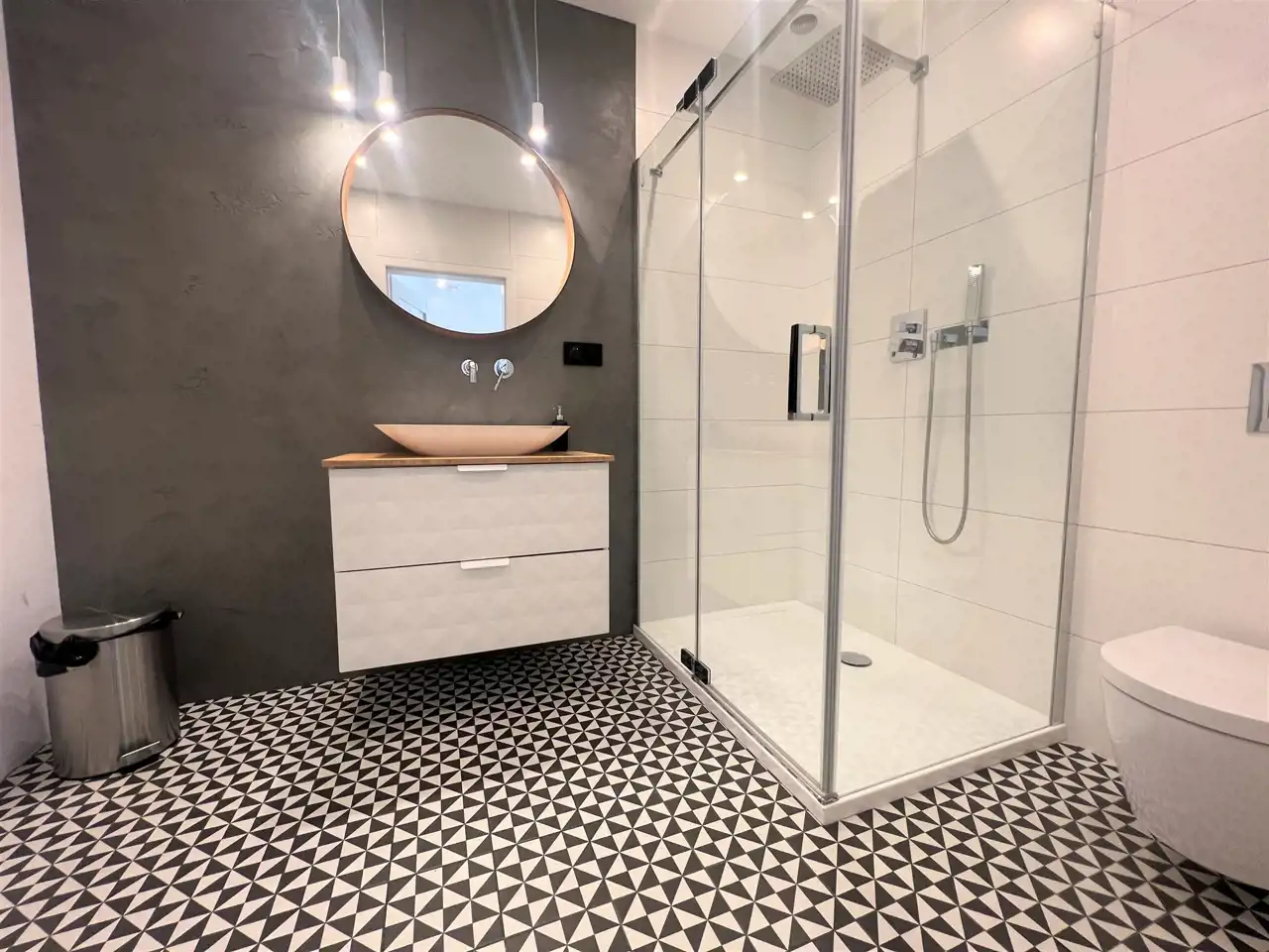- I ŁAZIENKA Z WC: umywalka z szafką z dużym lustrem ściennym, kabina prysznicowa, sedes podwieszany