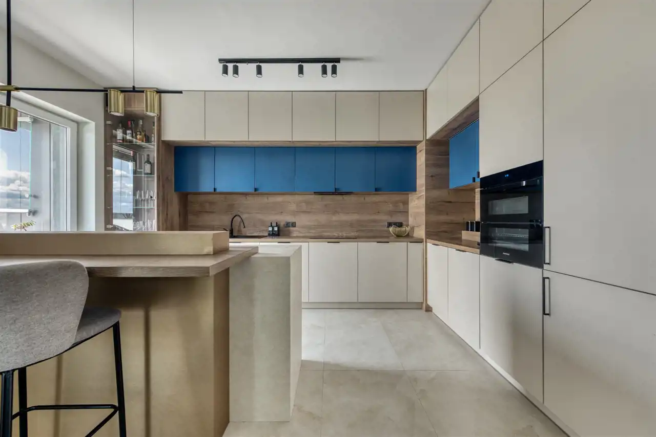 - funkcjonalną kuchnię z wyspą, połączoną z salonem, wyposażoną w mikrofalówkę, zmywarkę, lodówko-zamrażarkę, piekarnik, płytę indukcyjną z okapem;