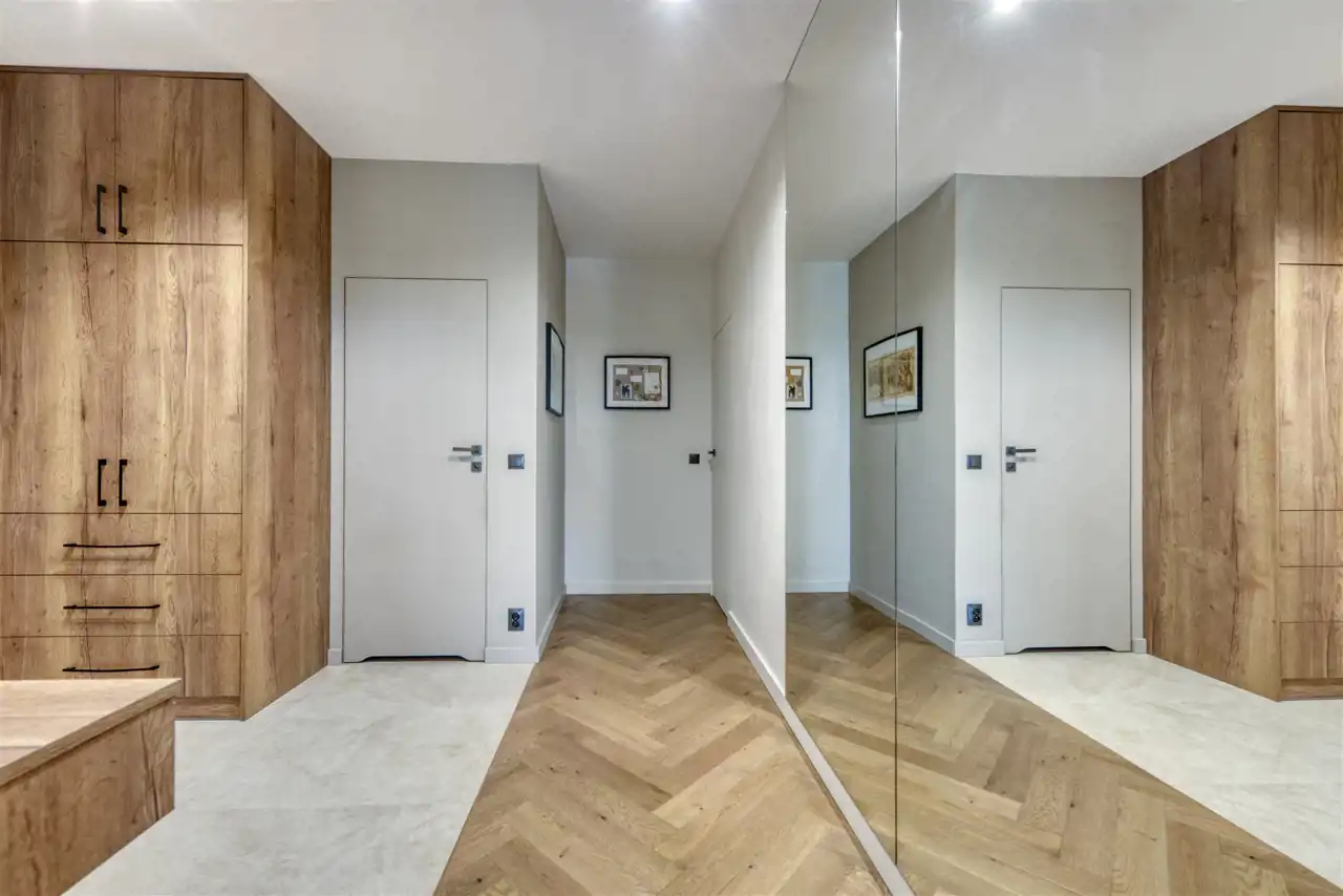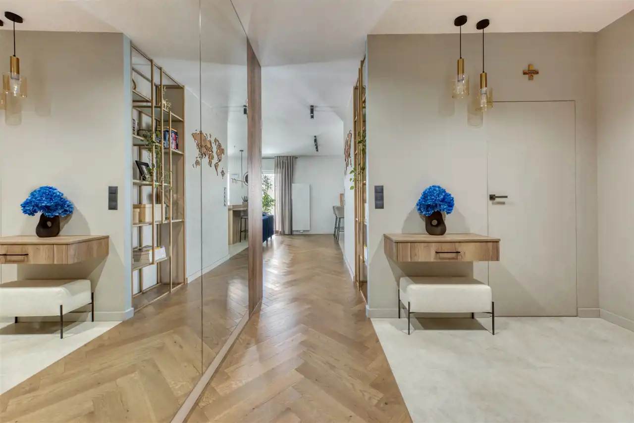 - duży przedpokój z pojemną garderobą wyposażoną w pralkę i suszarkę.