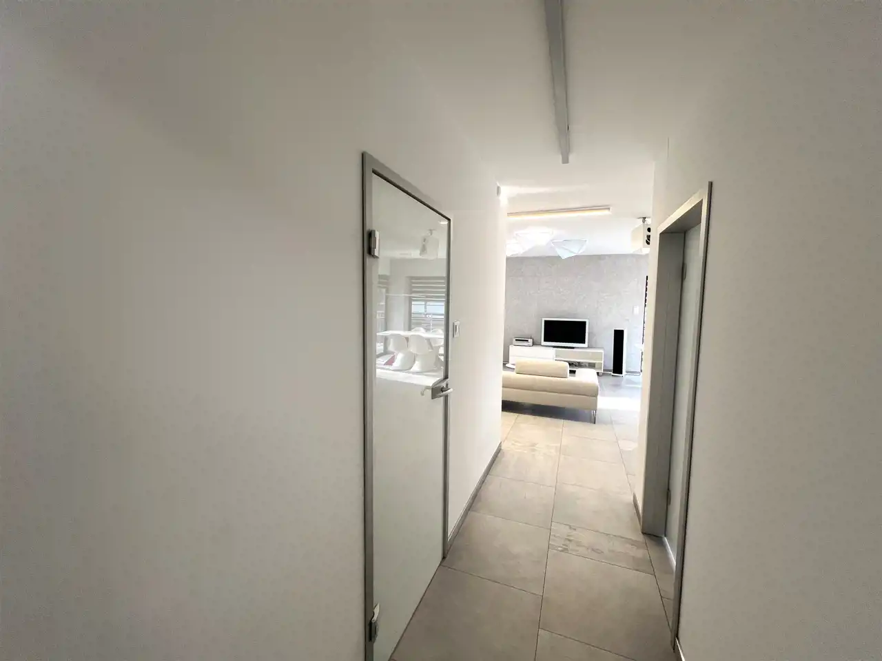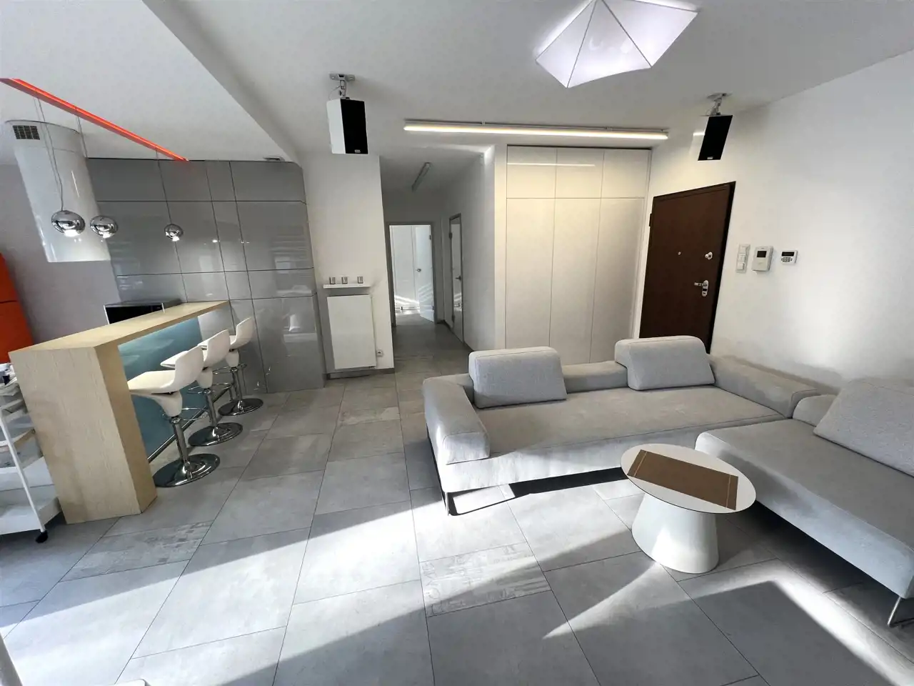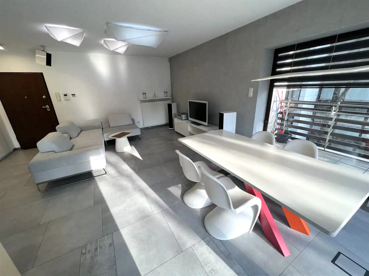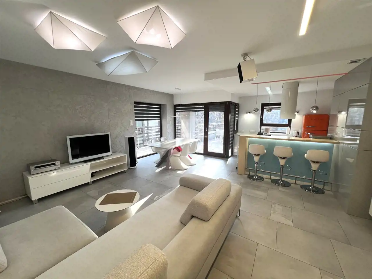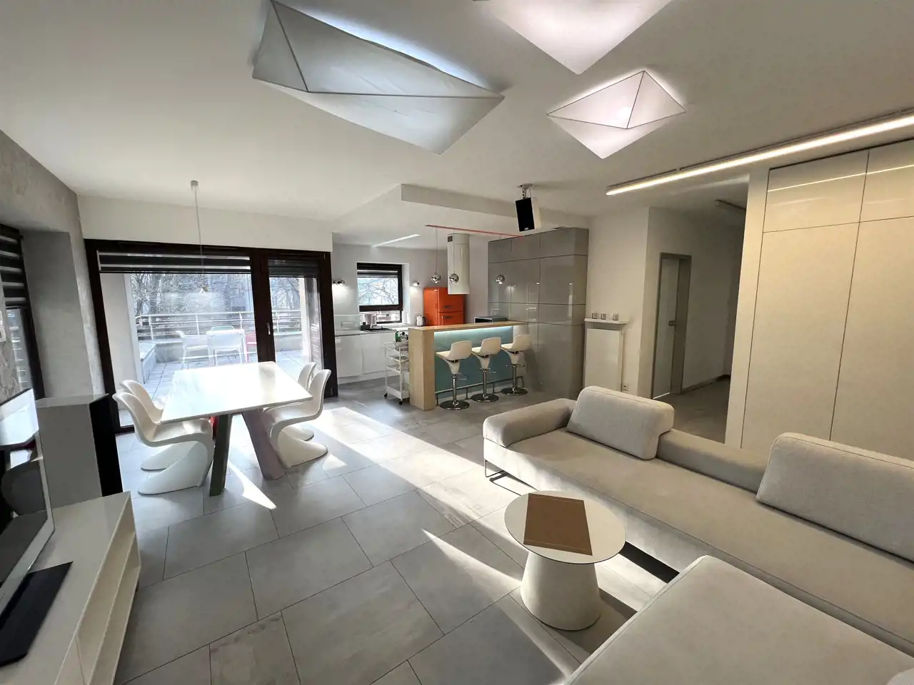 - SALON: 21,80 m², salonu wyjście na loggię i bardzo duży taras z widokiem na zieleń, duża kanapa narożna, rozkładana, stolik kawowy, szafka Rtv, telewizor 65", stół + 6 krzeseł,