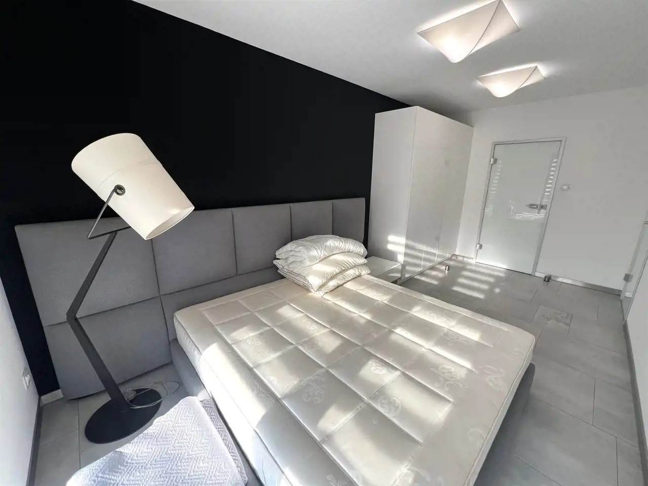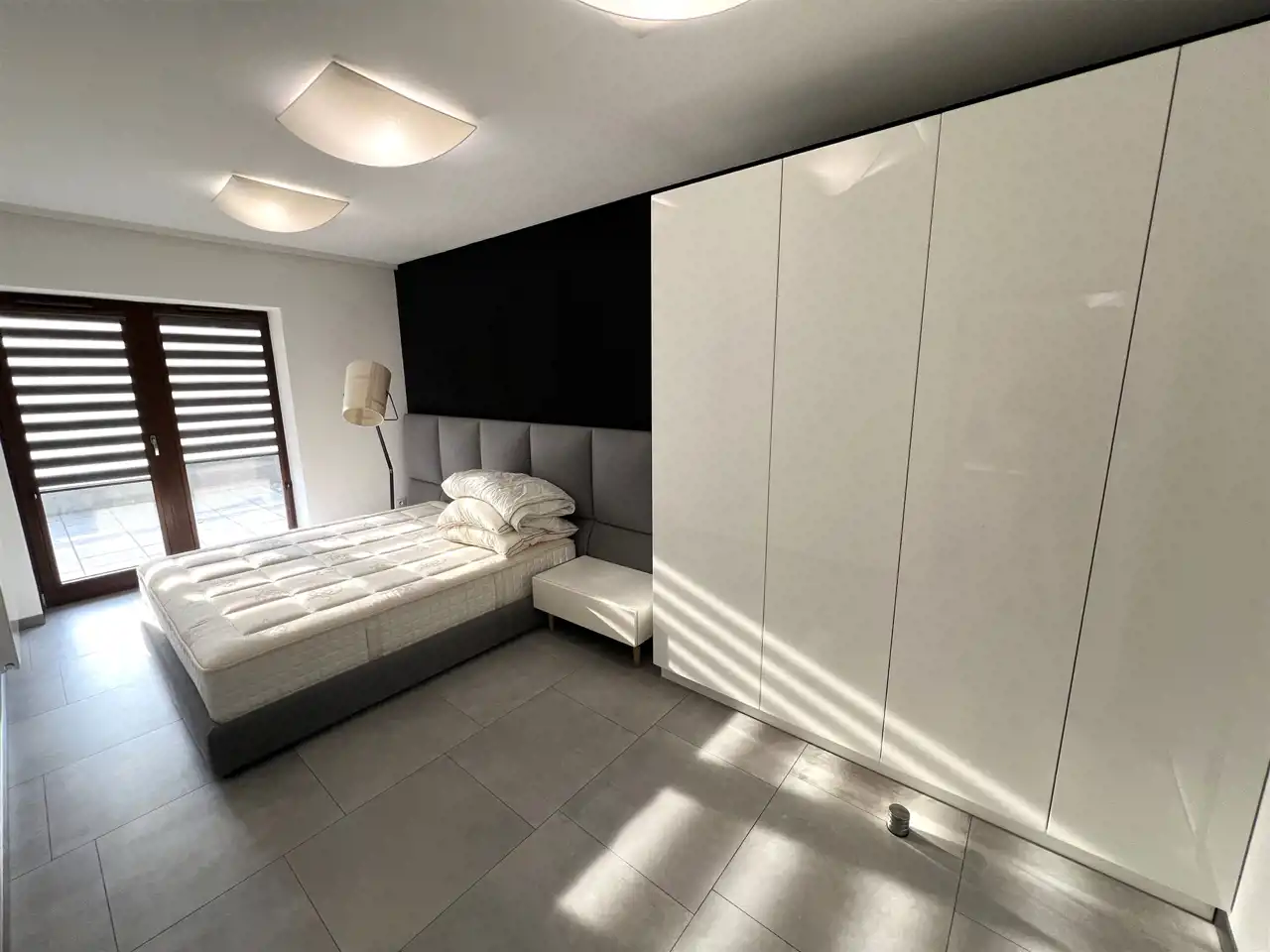 - SYPIALNIA Z ŁAZIENKĄ: 15,68 m², łóżko podwójne, szafka nocna, duża szafa garderoba, lampa stojąca, z sypialni wyjście na taras,