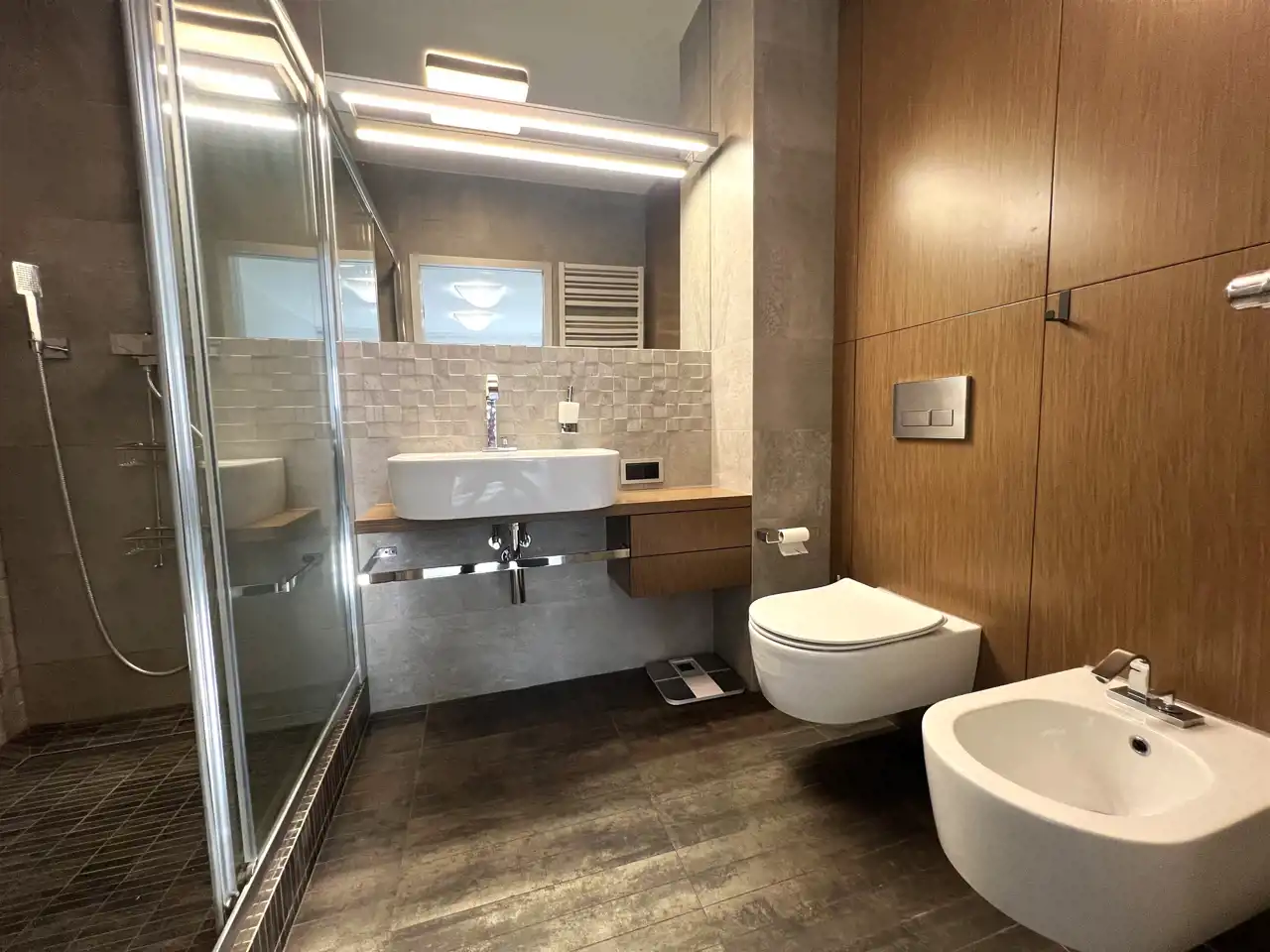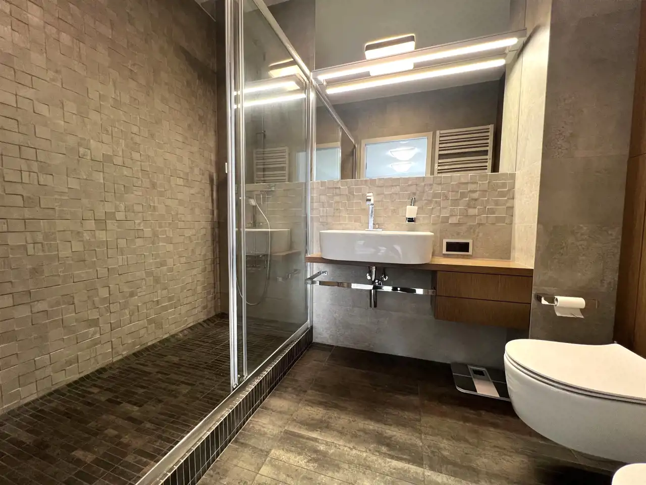 - ŁAZIENKA PRZY SYPIALNI: 4,98 m², kabina prysznicowa, umywalka nablatowa z lustrem, sedes, bidet,