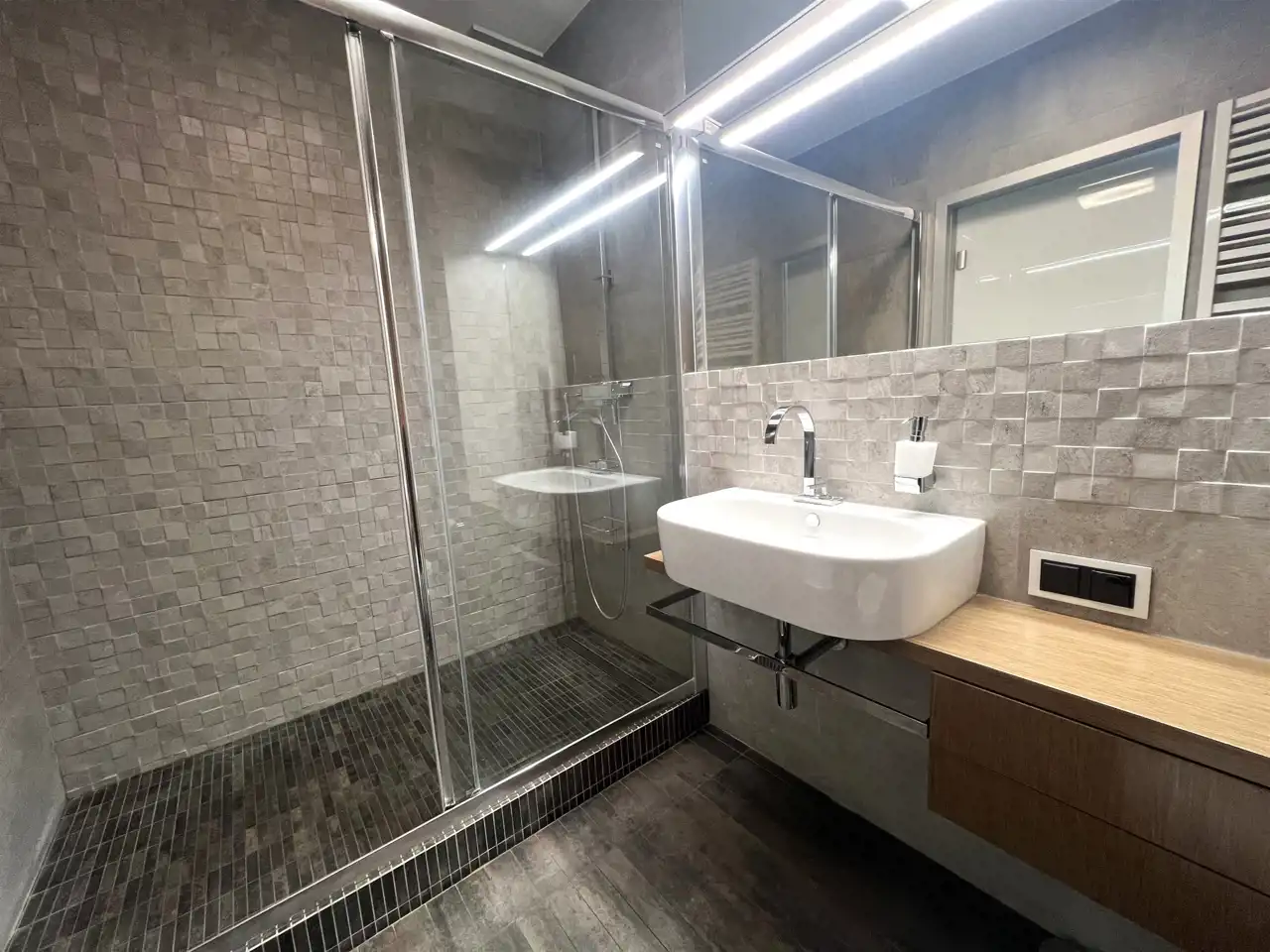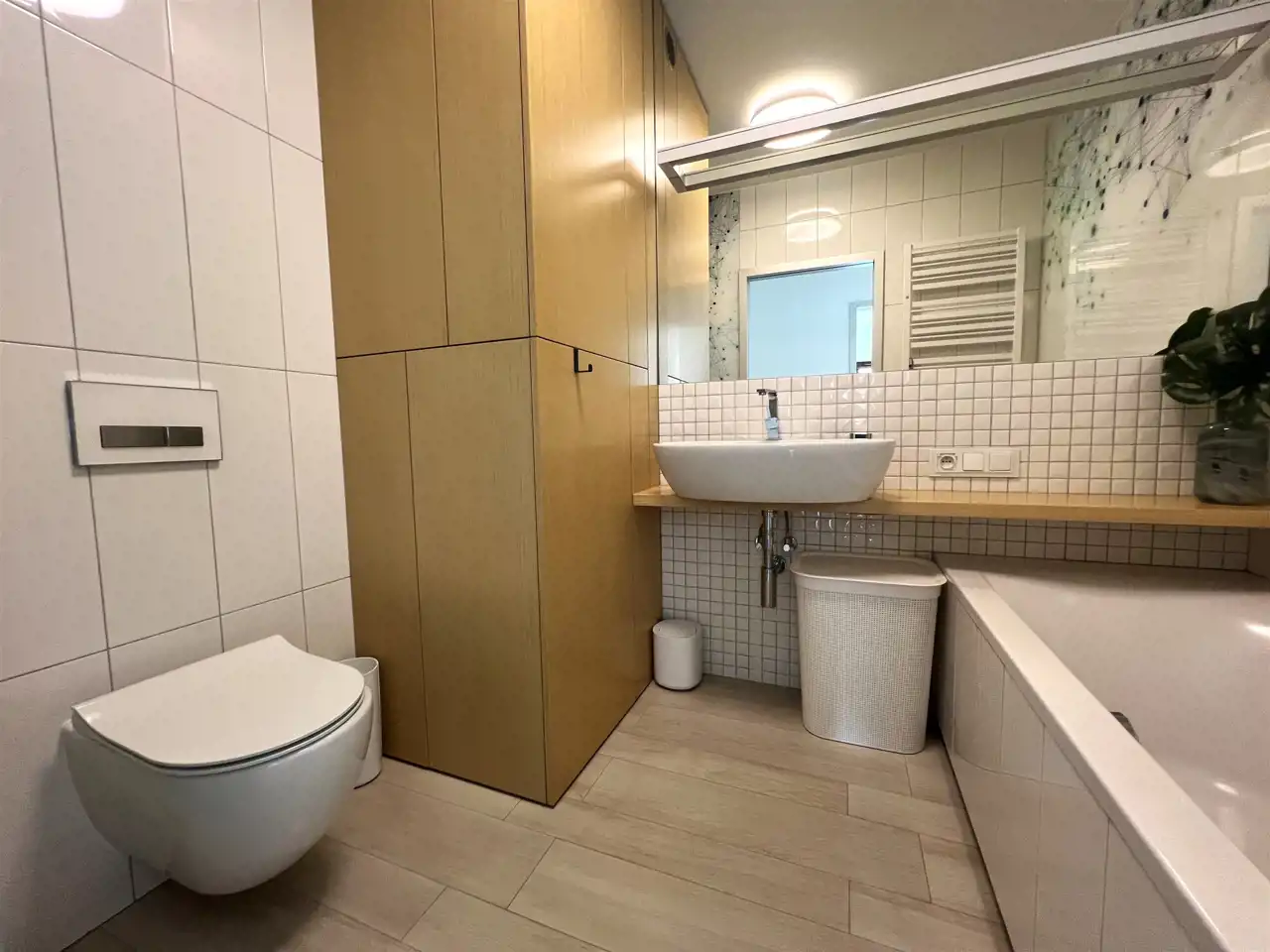 - ŁAZIENKA: 4,36 m², wanna, umywalka nablatowa z lustrem, sedes podwieszany, pralko-suszarka.
