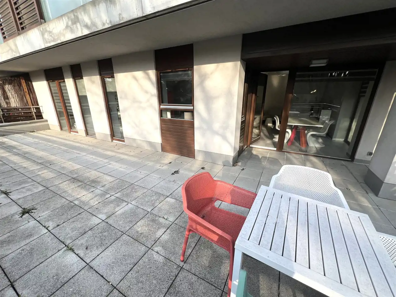 - LOGGIA: 4,95 m², połączona z olbrzymim TARASEM 58,90 m², całość wyłożona pytami bezfugowymi, od strony zachodniej z widokiem na zieleń, zestaw mebli ogrodowych,