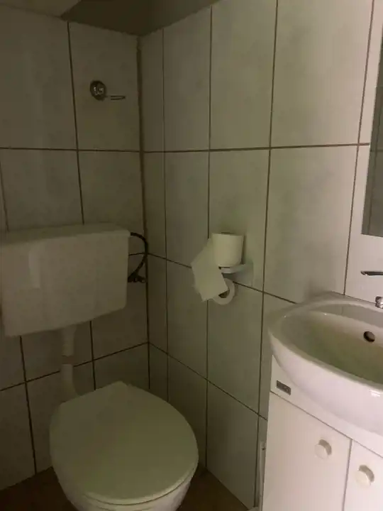 Łazienka z Wc: prysznic, umywalka z szafką, szafka z lustrem.