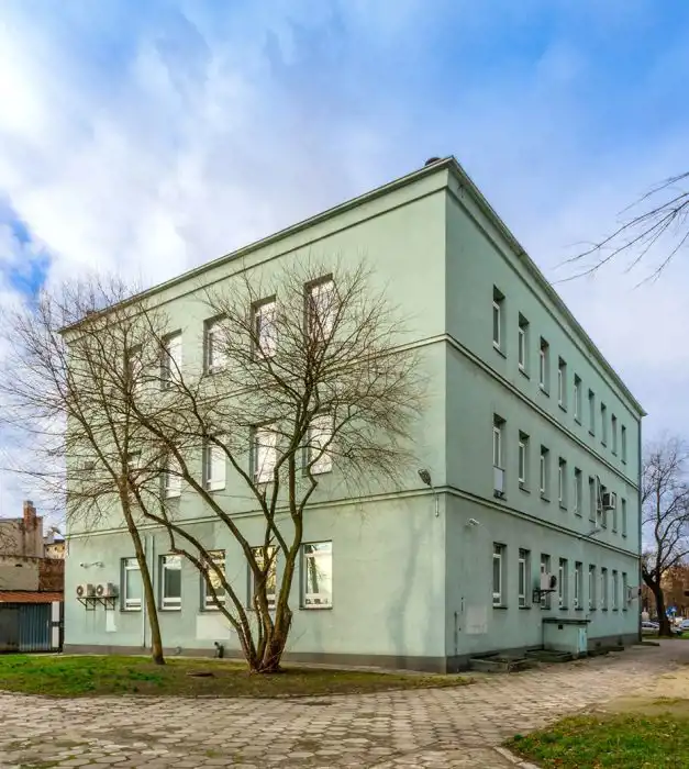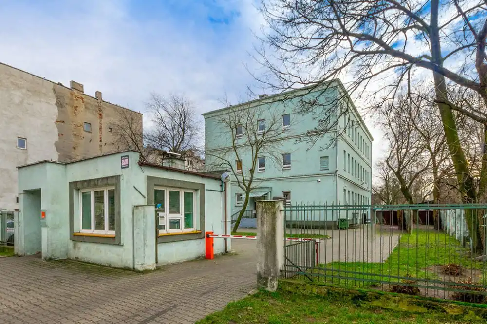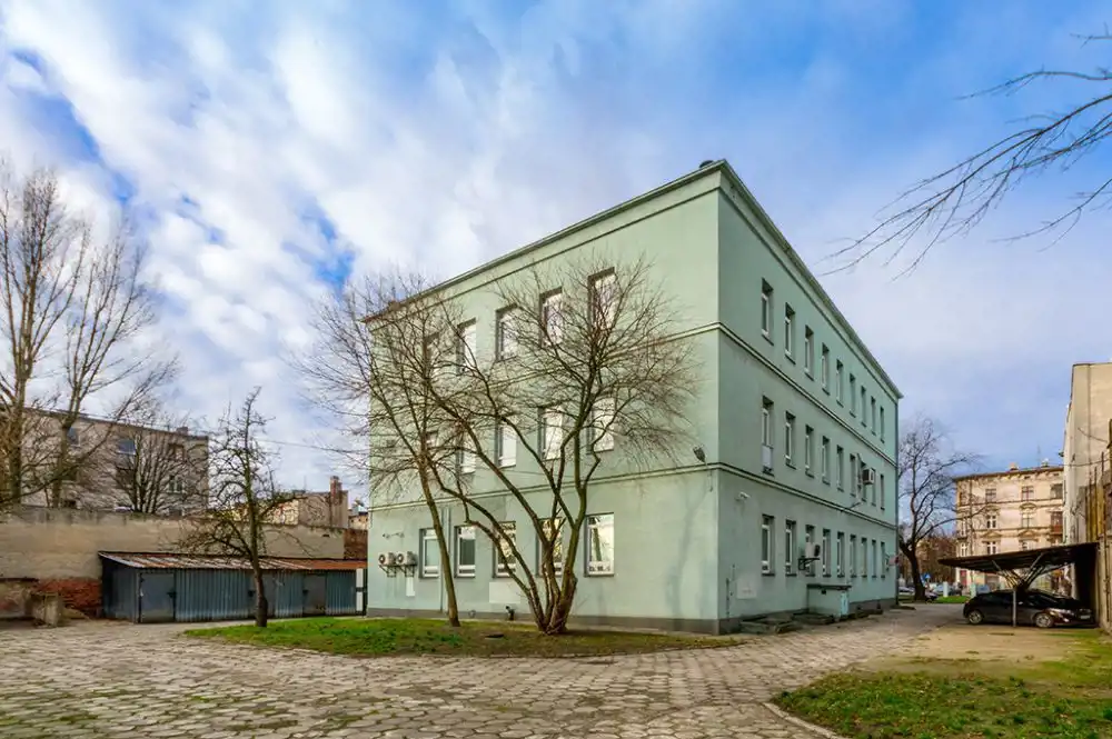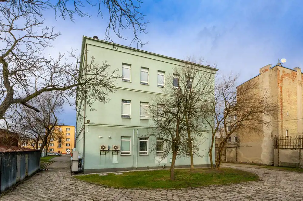 Budynek główny o powierzchni 1772, 1 m2, zlokalizowany w centrum dużej działki – prawie 3 500 m2 – został wzniesiony na planie prostokąta w konstrukcji tradycyjnej. Posiada 3 kondygnacje naziemne oraz jest w całości podpiwniczony. Do środka prowadzi jedno wejście, a komunikacja wewnątrz zapewniona jest przez klatkę schodową. Pomieszczenia na parterze i pierwszym piętrze zaaranżowane są w układzie gabinetowym z głównym ciągiem komunikacyjnym pośrodku. Wielkość gabinetów waha się w granicach 20-25 m2. Na drugim piętrze istniejący układ umożliwia dowolną aranżację pomieszczeń, z uwagi na brak ścian nośnych wewnątrz. Aktualnie na piętrze znajduje się open space wykorzystywany na cele biurowe. Nieruchomość posiada własny parking z ponad 20 miejscami postojowymi.