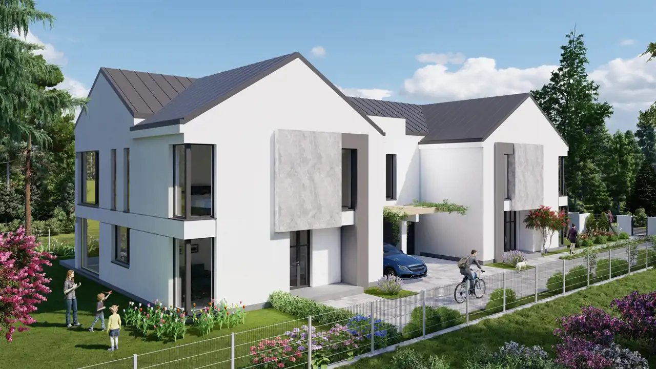 Dom jednorodzinny w zabudowie bliźniaczej,z garażem i z ogródkiem od strony południowej, położony w Łomiankach Dąbrowie Leśnej. Budynek wykonany będzie z energooszczędnych materiałów, w stanie deweloperskim, z dachem krytym blachą na rąbek stojący,z trzy szybową stolarką okienną, z ociepleniem ścian konstrukcyjnych styropianem grafitowym o zwiększonych parametrach izolacyjnych, z ociepleniem poddasza pianą poliuretanową - doskonałym izolatorem termicznym i akustycznym, z ogrzewaniem podłogowym wodnym w całym budynku, łącznie z poddaszem, z wszystkimi mediami miejskimi. Będzie można także wykorzystać dodatkową przestrzeń na poddaszu, tym bardziej,że zbudowane zostaną żelbetowe,wygodne schody na poddasze. Posesja będzie uporządkowana, z podejściem i podjazdem do budynku wyłożonym kostką granitową, będzie ogrodzona, z automatyczną bramą wjazdową i garażową, z videofonem (z instalacją także na piętrze), z instalacją telewizyjną,internetową,alarmową z zamontowanym systemem kamer, z wentylacją grawitacyjną i klimatyzacją.