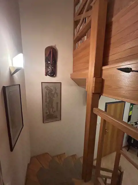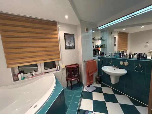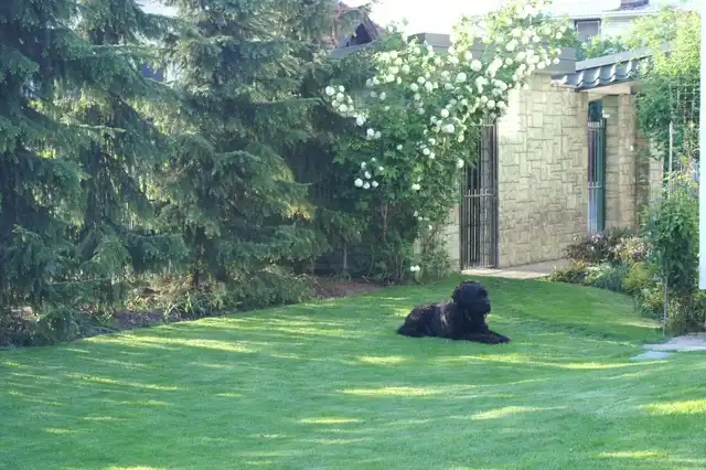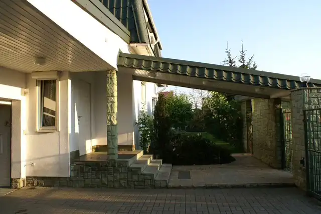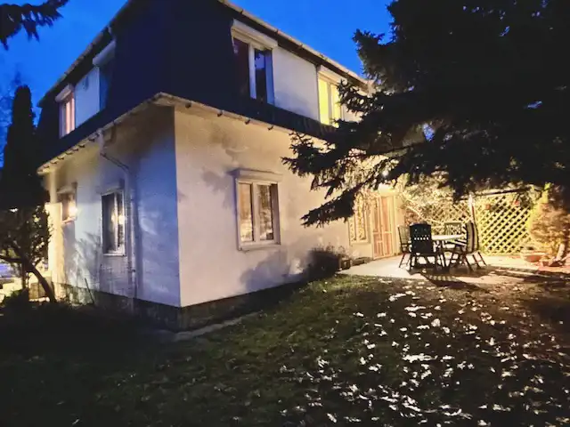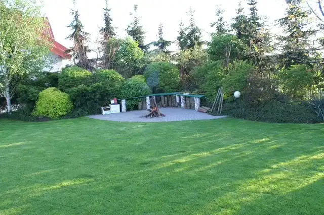 Z salonu wyjście na taras i do efektownego, dużego ogrodu. Na poziomie parteru znajduje się też gabinet i łazienka z kabiną prysznicową. Garaż na 2 samochody. Na piętrze jest otwarta biblioteka z telewizorem, drugi gabinet, 2 sypialnie, przestronna garderoba z oknem i pokój kąpielowy z wanną. Dom nie jest nowoczesny ale mieszka się w nim tanio i bardzo wygodnie.