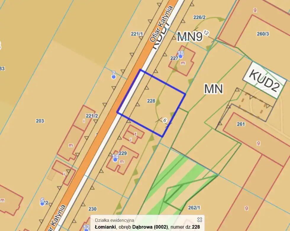 Działka jest w kształcie zbliżonym do kwadratu o boku około 26-27m. Objęta jest miejscowym planem zagospodarowania przestrzennego z przeznaczeniem MN9 - zabudowa mieszkaniowa jednorodzinna (UCHWAŁA NR XLV/526/2018 RADY MIEJSKIEJ W ŁOMIANKACH).