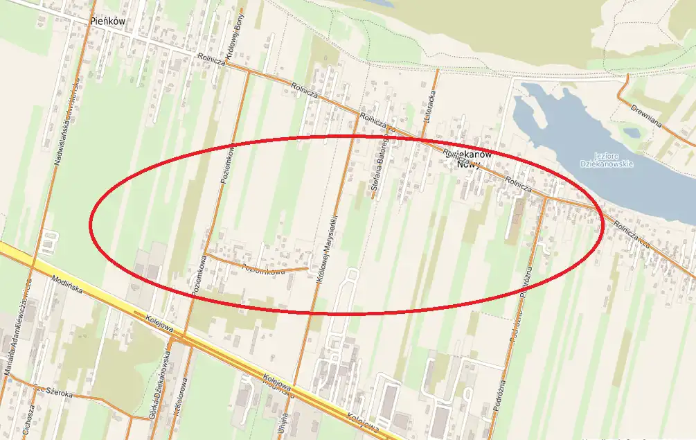 Na sprzedaż działka inwestycyjna o powierzchni 10 000 m2, położona w miejscowości Dziekanów Nowy, niedaleko Jeziora Dziekanowskiego w rejonie ulicy Królowej Marysieńki.