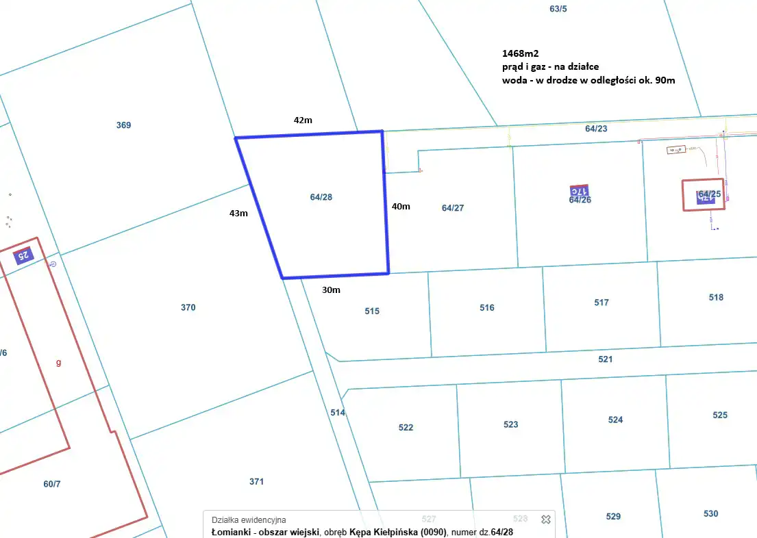 - Media Woda: w ulicy; Kanalizacja: brak; Prąd: na działce; Gaz: na działce