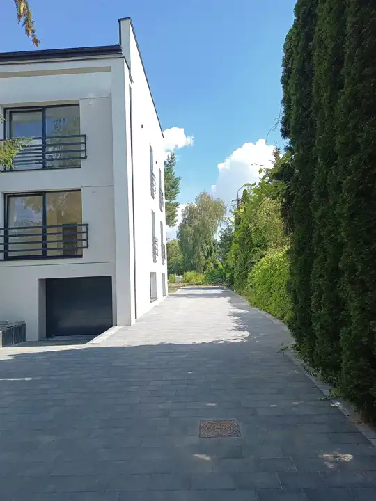 Wjazd na posesję i do garażu jest wyłożony kostką.