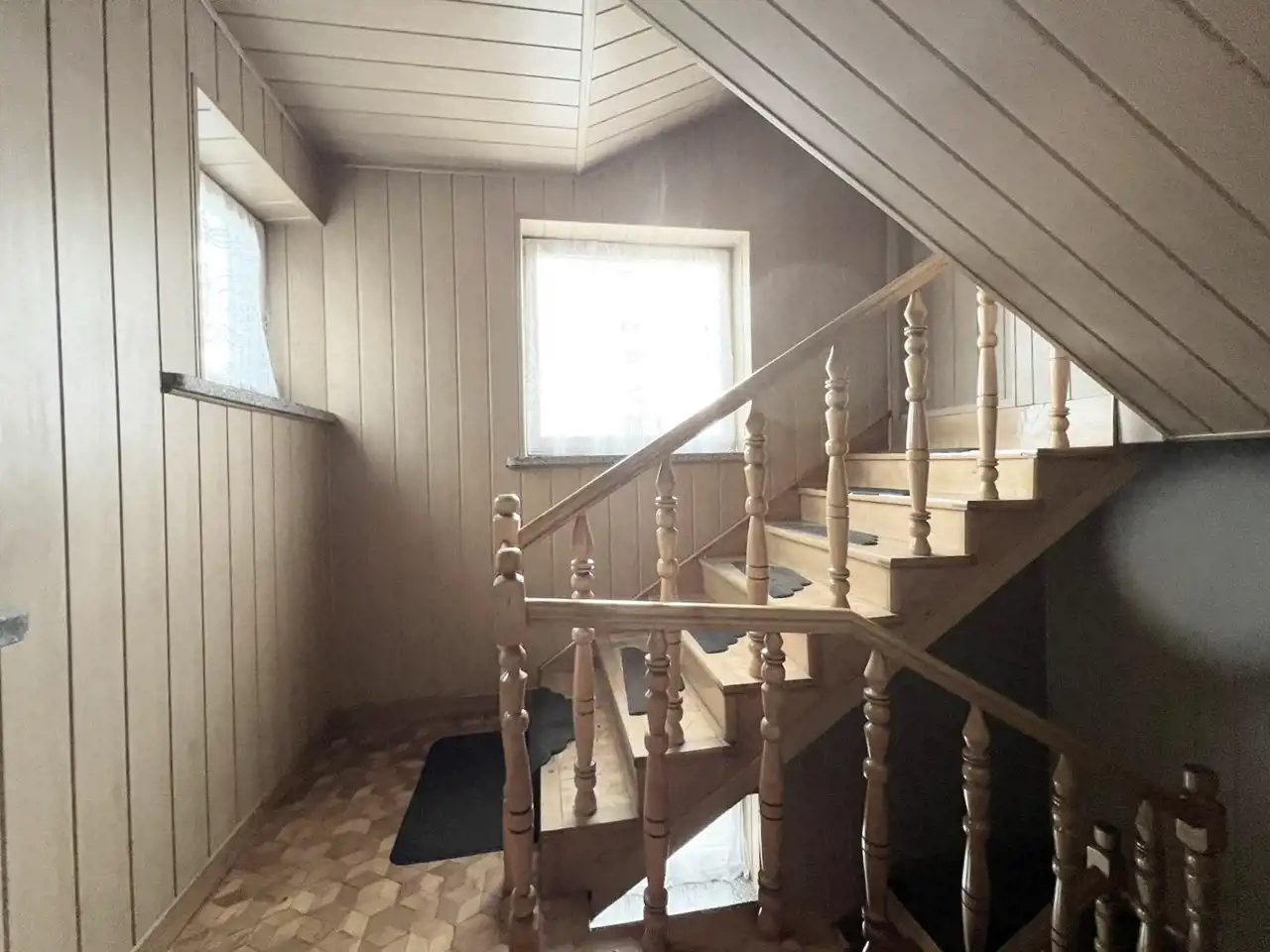 Window frames are partially PVC and partially wooden. Wooden floorboards in rooms and corridor, wooden mosaic on the staircase, ceramic tiles in the bathroom, and linoleum in the kitchen.