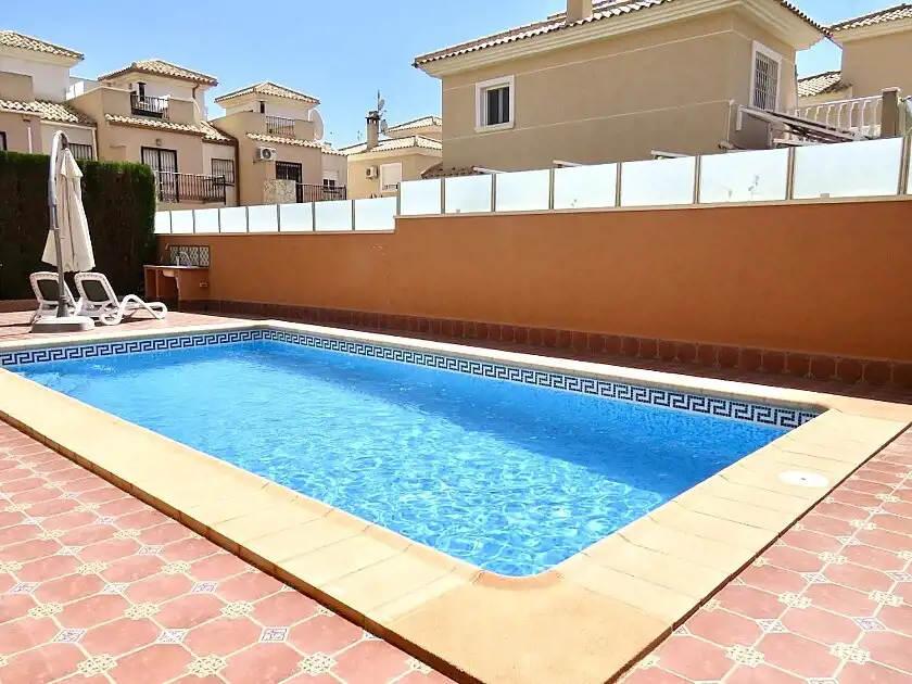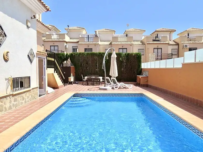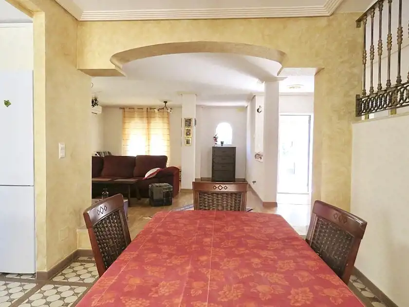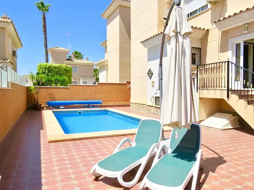 Przestronna wolnostojąca willa z 3 sypialniami i 3 łazienkami w Los Altos, z prywatnym basenem i ogrodem, położona w prywatnej dzielnicy mieszkalnej ze wspólnym basenem. Ten dom ma 3 sypialnie, 3 łazienki, salon-jadalnię z kominkiem, kuchnię i salon-jadalnię. W piwnicy znajduje się kolejny duży salon, sauna z toaletą i prysznicem, taras oraz garaż. Jest w bardzo dobrym stanie, jest sprzedawane z meblami i sprzętem AGD, klimatyzacją i ogrzewaniem podłogowym w kuchni. Położony w pobliżu centrów handlowych z supermarketami, restauracjami, barami i innymi usługami. Kilka minut od plaż Punta Prima, Playa Flamenca i La Zenia, 5-10 minut autem do czterech pól golfowych, Torrevieja i centrum handlowego Zenia Boulevard.