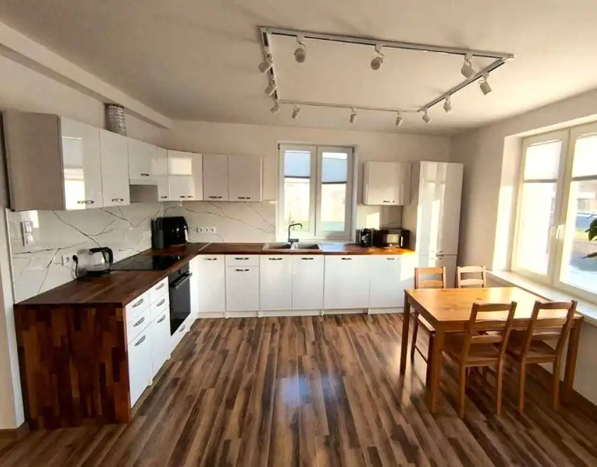 Kuchnia – duża z jadalnią, doskonale wyposażona, w nowoczesnej zabudowie, w jasnej , modnej kolorystyce .