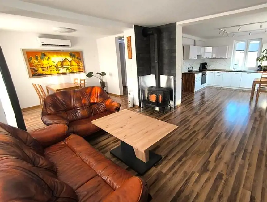 Ogrzewanie podłogowe (pompa ciepła oraz kominek 10kW w salonie), klimatyzacja 5,5 kW w salonie i 3,5kW w pokoju