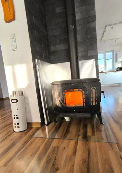 Ogrzewanie zapewniają -piec na ekogroszek sterowany elektronicznie o mocy 10 KW , wspomagany przez elektryczny piec indukcyjny oraz kominek wyposażony w tzw. " kozę " o mocy 10 KW .